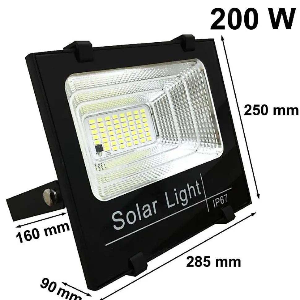 - Avec une consommation électrique 200W, notre Projecteur Solaire LED 200W IP65 Dimmable avec Détecteur (Panneau Solaire + Télécommande Inclus) possède un éclairage de 18000 lumens.