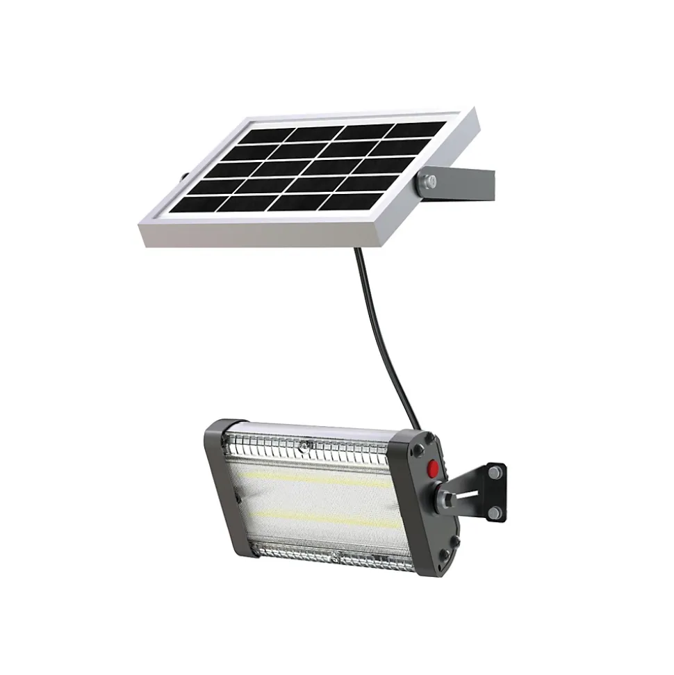 Projecteur LED solaire multifonction avec télécommande et batterie 3000lm avec jusqu’à 12h d’autonomie.Où puis-je utiliser le projecteur LED avec panneau photovoltaïque extérieur et batterie ?Ce projecteur LED avec panneau photovoltaïque extérieur et batterie Li-Ion est adapté pour une utilisation dans des environnements où l’électricité n’arrive pas. Il se compose d’un projecteur solaire avec 3,5 mètres de câble étanche et d’un panneau photovoltaïque pouvant être placé à distance. De cette façon, vous pouvez éclairer toutes les zones même difficiles à atteindre avec le soleil, comme les greniers, les garages, les remises, les cours ou les trottoirs. Très lumineux à puissance maximale. Grâce à la télécommande il est possible de varier l’intensité de la lumière et de l’allumer si nécessaire.Caractéristiques techniques :- Equipé de la technologie Adaptive Light System 2.0 (ALS2.0) qui garantit un fonctionnement jusqu’à 8 jours consécutifs par temps nuageux et pluvieux.- Equipé d’une télécommande.- Equipé de différents modes de fonctionnement.- Panneau solaire : 14V 5W.- Batterie : 3,7 V 5 200 mAh, 2xLi-Ion 18650.- Temps de charge de la batterie : environ 7 heures.- Autonomie de la batterie : >12 heures.- Seuil d’activation du capteur crépusculaire : 10lux.- Seuil de désactivation du capteur crépusculaire : 80lux.- Température de couleur : 4000K.- Flux lumineux : 3000lm.- Angle d’écoulement : 120°.- Cycles d’allumage : 25 000 cycles.- Durée de vie utile : 50 000 heures.- Degré de protection : IP65.- Hauteur d’installation : 2-5m- Longueur totale du câble : 3,5 mètres- Poids du phare : environ 545g.- Poids du panneau solaire : environ 505g