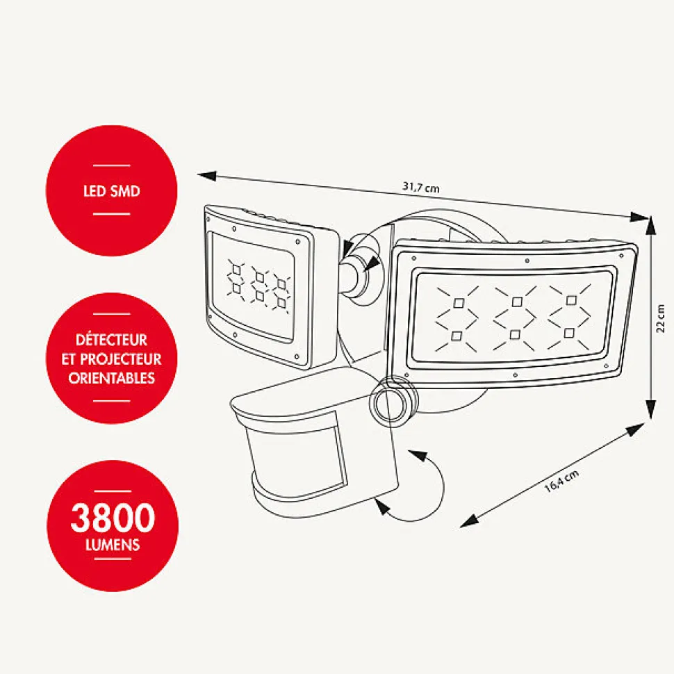 Très éclairant ! Ce projecteur noir à détection de mouvements de qualité professionnelle avec alarme de sécurité, va vous permettre d’éclairer vos extérieurs !• Couleur LED : Blanc• Couleur du produit : Noir• Nombre de LED : 56 LED• Luminosité : 3800 lumens• Dimensions : L31.7 x H22.8 x l16.4cm• Alimentation : sur secteur• Puissance : 48W• Tension : 230V• Projecteur à détection 10m de portée, angle de 120°• Angle de détection : 240°• Matière : Aluminium• Garantie : 2 ansUsage & installation :L’indice IP44 vous garantit une étanchéité face à toutes météos.Données techniques :Le projecteur est composé de 56 LED SMD forte luminosité, à durée de vie très longue. Il propose 3 modes de fonctionnement : mode détection 5sec, 1 min, 3min ou 10min d’allumage) ; mode forcé : vous permettant un éclairage en continu et un mode test. Le boîtier marche – arrêt – auto est protégé. Le détecteur de mouvements et le projecteur sont orientables en hauteur (ne se déclenche pas au passage d’un animal). L’angle de détection est de 240° et la distance de détection est de 10m, 15m ou 20m. Son angle de projection lumineuse est de 120°. Les accessoires de visseries sont fournis.Le projecteur est vendu sans prise, il doit être relié à votre installation électrique par des électriciens qualifiés, informés des normes et des exigences techniques de l’appareil et de son installation correcte.Source lumineuse : Le projecteur dispose de 56 LED d’une intensité de 3800 lumens.