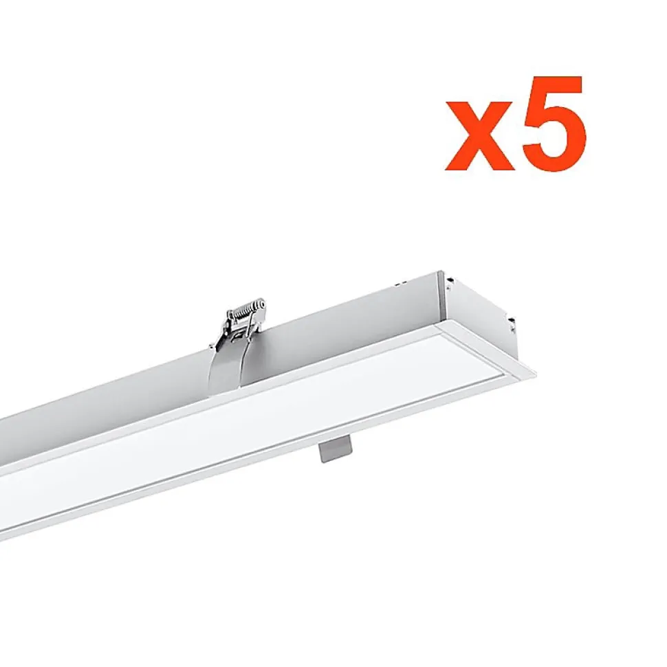 Alliez performance lumineuse et esthétique professionnelle avec ce lot de 5 réglettes LED encastrables 120cm 35W. Idéal pour des projets d’éclairage uniformes dans les bureaux, couloirs, commerces ou zones de travail, ce pack offre une solution fiable et discrète pour les plafonds encastrés.Caractéristiques techniques des réglettes encastrables LED 120cmPuissance unitaire : 35W (soit 175W au total pour le lot).Flux lumineux par réglette : 3500 lm, soit 17 500 lm cumulés.Efficacité lumineuse : 100 lm/W.Angle d’éclairage : 120°, lumière homogène et sans zones d’ombre.Dimensions unitaire : 120 x 7,5 x 3,5 cm.Installation : à encastrer, non orientable.Indice de protection : IP20, usage intérieur.Rendu des couleurs : IRC Ra ≥ 80.Classe énergétique : F.Tension : 220-240V AC / fréquence : 50-60Hz.Matériau : PVC.Finition : blanche.Durée de vie : ~30 000 heures.Température de fonctionnement : -30°C à +50°C.Certification : CE & RoHS.Garantie : 2 ans.Conditionnement : 5 réglettes + visserie de fixation incluse.Les points forts du pack de réglettes encastrables LED 35WCe lot de 5 réglettes LED encastrables est pensé pour simplifier vos installations multiples, tout en garantissant une lumière puissante et professionnelle. Leur conception fine et encastrable s’intègre parfaitement au