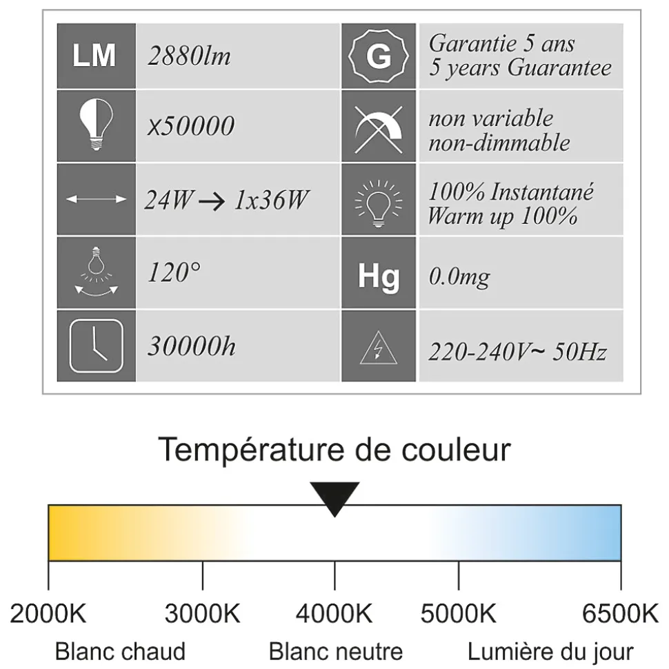 Réglette LED Étanche 1200mm – 24W (Équiv. 1x36W) – 2880 LM – blanc neutre (4000K) – IP65Un éclairage puissant et éco-énergétiqueCette réglette LED de 24W avec LED intégrée est la solution idéale pour remplacer les luminaires étanches à néon 1x36W, offrant une alternative plus performante et économique.Avec son flux lumineux élevé de 2880 lumens et une consommation réduite de 24W seulement, elle garantit des économies d’énergie considérables sans compromis sur la qualité d’éclairage. Sa température de couleur blanc neutre (4000K) assure un éclairage homogène et agréable pour tous types d’environnements professionnels ou industriels.Robuste et parfaitement étancheAvec son indice de protection IP65, cette réglette est totalement étanche à l’eau et à la poussière, idéale pour une installation en environnements exigeants : usines, parkings, garages, ateliers et entrepôts. Son indice de résistance aux chocs IK08 lui confère une excellente durabilité.Installation rapide et pratiqueSystème de câblage traversant permettant le chaînage de plusieurs réglettes sans multiplication des raccordements.Connexion simplifiée pour une installation en saillie ou suspendue en toute facilité.Caractéristiques techniques :Puissance réelle : 24WÉquivalence : 1x36WFlux lumineux : 2880 lm (120 lm/W)Ancienne norme 2012 : A+Nouvelle norme 2021 : ETempérature de couleur : 4000K (blanc neutre)Angle de diffusion : 120°Indice de protection : IP65 (étanche)Indice de résistance : IK08 (antichoc)Durée de vie : 50 000 heuresNombre de cycles ON/OFF : 30 000Facteur de puissance : > 0.9Type de LED : SMDDiffuseur : OpaqueMatériau du cadre : GrisTension : 220-240VInstallation : Saillie ou suspendueDimension : 1200 x 72 x 61 mmNormes : CE, ROHSGarantie : 5 ansApplications :Industrie & entrepôt : Usines, zones de stockageMobilité & stationnement : Parkings, garagesAteliers & locaux professionnelsUn éclairage puissant, économique et durable pour tous vos espaces !