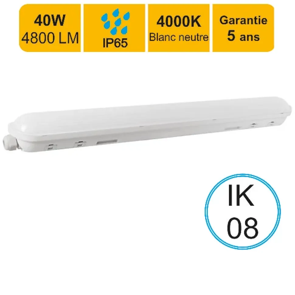 Réglette LED Étanche 1200mm – 40W (Équiv. 2x36W) – 4800 LM – blanc neutre (4000K) – IP65Un éclairage puissant et éco-énergétiqueCette réglette LED de 40W avec LED intégrée est la solution idéale pour remplacer les luminaires étanches à néon 2x36W, offrant une alternative plus performante et économique.Avec son flux lumineux élevé de 4800 lumens et une consommation réduite de 40W seulement, elle garantit des économies d’énergie considérables sans compromis sur la qualité d’éclairage. Sa température de couleur blanc neutre (4000K) assure un éclairage homogène et agréable pour tous types d’environnements professionnels ou industriels.Robuste et parfaitement étancheAvec son indice de protection IP65, cette réglette est totalement étanche à l’eau et à la poussière, idéale pour une installation en environnements exigeants : usines, parkings, garages, ateliers et entrepôts. Son indice de résistance aux chocs IK08 lui confère une excellente durabilité.Installation rapide et pratiqueSystème de câblage traversant permettant le chaînage de plusieurs réglettes sans multiplication des raccordements.Connexion simplifiée pour une installation en saillie ou suspendue en toute facilité.Caractéristiques techniques :Puissance réelle : 40WÉquivalence : 2x36WFlux lumineux : 4800 lm (120 lm/W)Ancienne norme 2012 : A+Nouvelle norme 2021 : ETempérature de couleur : 4000K (blanc neutre)Angle de diffusion : 120°Indice de protection : IP65 (étanche)Indice de résistance : IK08 (antichoc)Durée de vie : 50 000 heuresNombre de cycles ON/OFF : 30 000Facteur de puissance : > 0.9Type de LED : SMDDiffuseur : OpaqueMatériau du cadre : GrisTension : 220-240VInstallation : Saillie ou suspendueDimension : 1200 x 72 x 61 mmNormes : CE, ROHSGarantie : 5 ansApplications :Industrie & entrepôt : Usines, zones de stockageMobilité & stationnement : Parkings, garagesAteliers & locaux professionnelsUn éclairage puissant, économique et durable pour tous vos espaces !