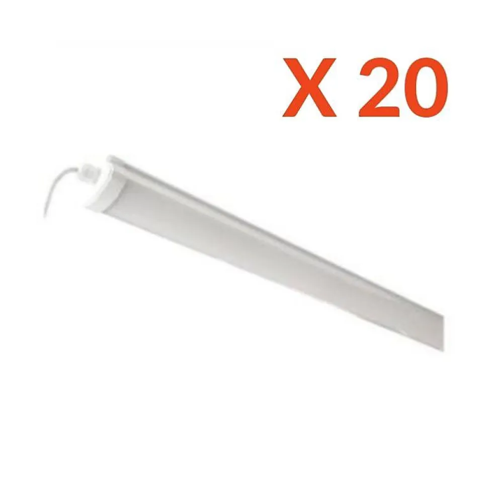 Le lot de 20 réglettes LED 120cm 36W IP65 est conçu pour répondre aux besoins des grands espaces. Avec 3600 lumens par unité et une étanchéité renforcée, il garantit puissance, durabilité et sécurité dans les environnements exigeants.Spécifications techniques du lot de 20 réglettes LED IP65Puissance : 36W par régletteLuminosité : 3600 lm (100 lm/W)Angle d’éclairage : 120°, large diffusion lumineuseIRC : Ra 80, rendu naturel des couleursDimensions : 120 x 6,5 x 4,7 cmIndice de protection : IP65, étanche et anti-poussièreDurée de vie : ~25 000 heuresClasse énergétique : FTension : 220-240V AC, branchement directFréquence : 50-60HzMatériau : ABS robusteCertification : CE & RoHSGarantie : 2 ansConditionnement : pack de 20 réglettes⚠️ Supports de fixation et transformateur inclus. Ne pas retirer le cache situé à l’extrémité de la réglette.Les avantages du pack de réglettes LED étanches 36WCe pack de 20 réglettes LED 120cm étanches offre un éclairage puissant et homogène, soit un total de 72 000 lumens (20 x 3600 lm). Grâce à leur protection IP65, elles sont parfaites pour résister à l’humidité et à la poussière. Elles assurent confort visuel, efficacité énergétique et durabilité, même dans des conditions difficiles.Installation des réglettes LED étanches 120cmFixez les supports de montage fournis au plafond ou au murConnectez chaque r