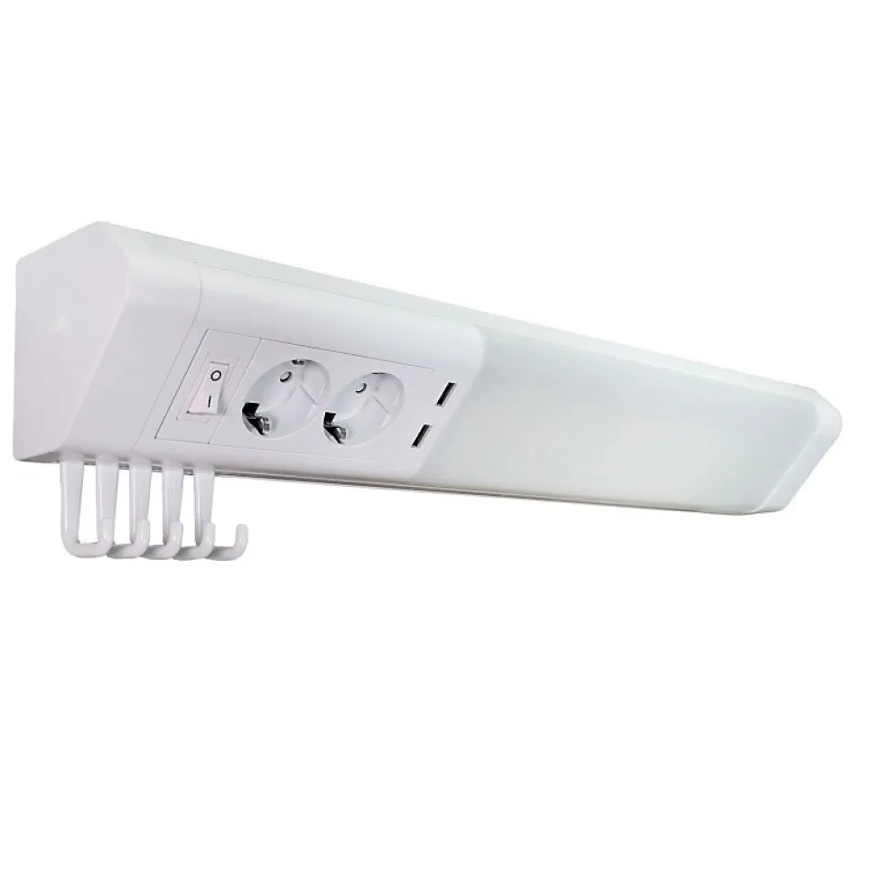 Les caractéristiques techniquesLa réglette Led Carvo de Tibelec peut être installée dans une cuisine ou une salle de bain en applique murale.Elle intègre une technologie Led basse consommation.Elle possède un interrupteur on/off .Elle est équipée de 2 prises électriques, 2 ports USB et crochets de suspension.Les avantages esthétiquesAvec son design en plastique blanc, cette réglette Carvo de Tibelec est idéale pour optimiser les petits espaces style studio ou logement étudiant.Son éclairage blanc neutre et ses 1000 lumens vous procureront une lumière efficace et dynamisante.Elle est équipée de 2 prises de courant vous permettant de brancher appareils électro-ménagers ou rasoirs, 2 ports USB pour recharger votre portable ou tablette et 5 crochets pour pendre torchons ou spatules dans une kilchenette ou gant ou serviette dans une salle d’eau.