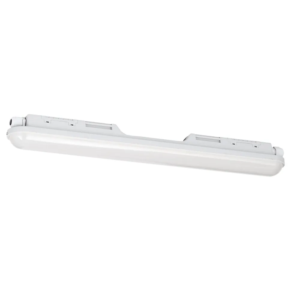 Compacte, performante et résistante, la réglette LED Pro LED-E IP65 d’Eglo est la solution idéale pour éclairer efficacement vos espaces, même exposés à l’humidité ou à la poussière. Grâce à sa protection IP65, elle convient aussi bien à un usage intérieur qu’extérieur couvert, comme un garage, un atelier ou une cave. Avec sa puissance lumineuse de 1250 lumens et son éclairage blanc froid, elle garantit une visibilité optimale, parfaite pour les zones nécessitant un bon niveau de lumière. Sa forme compacte (L.54 x l.6 x H.6 cm) permet une installation discrète au plafond, tout en conservant un excellent éclairage grâce au diffuseur intégré.
