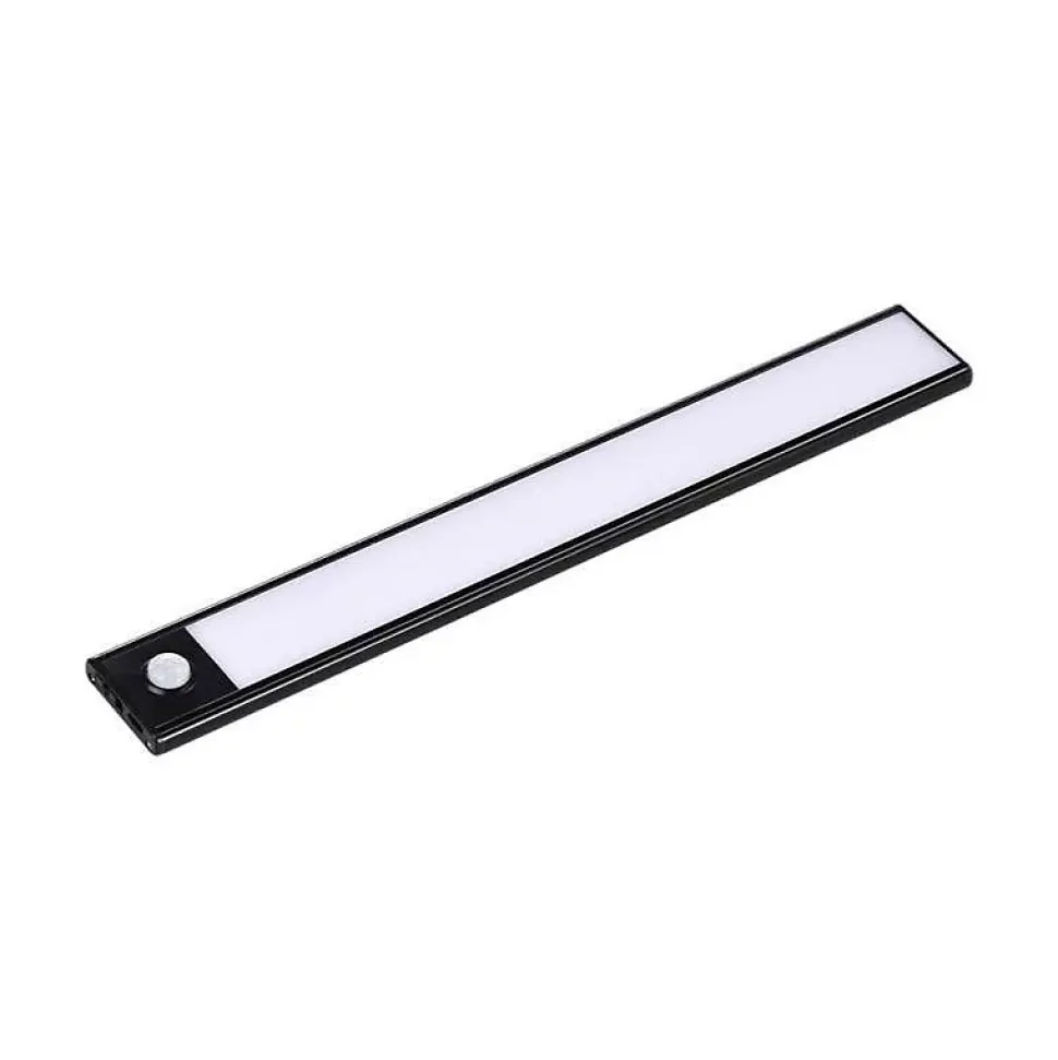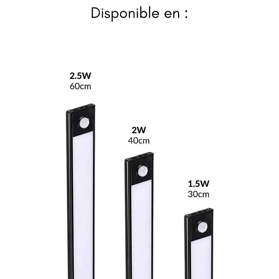 Compacte, discrète et facile à installer, la réglette LED rechargeable 30 cm noire avec détecteur de mouvement est parfaite pour l’éclairage d’appoint sous vos meubles, dans un placard ou le long d’une étagère. Elle s’allume automatiquement à la détection d’un mouvement et se recharge facilement via USB.Caractéristiques techniques de la réglette LED 30 cm avec capteur de mouvementPuissance : 1,5W, consommation ultra faible.Flux lumineux : 110 lumens, rendement de 73 lm/W.Détecteur de mouvement intégré : activation automatique en présence d’un mouvement.Autonomie : 5 à 6 heures d’éclairage en usage normal.Temps de charge : environ 4 heures via USB (câble fourni).Modes de fonctionnement : manuel, automatique ou éclairage fixe.Dimensions : 30 x 9 x 0,4 cm, ultra fine et discrète.Alimentation : batterie interne rechargeable via USB 5V.Courant : 300 mAh.Indice de protection : IP20, usage intérieur uniquement.IRC : Ra 80, bon rendu des couleurs.Classe énergétique : G.Matériau : aluminium, design robuste et élégant.Couleur : noire.Certification : CE & RoHS.Garantie : 2 ans.Les avantages de cette réglette LED noire rechargeable USBCette réglette LED 30 cm avec détecteur de mouvement offre un éclairage localisé très pratique, sans installation électrique. Grâce à sa bande adhésive, elle se fixe rapidement sous une étagère,