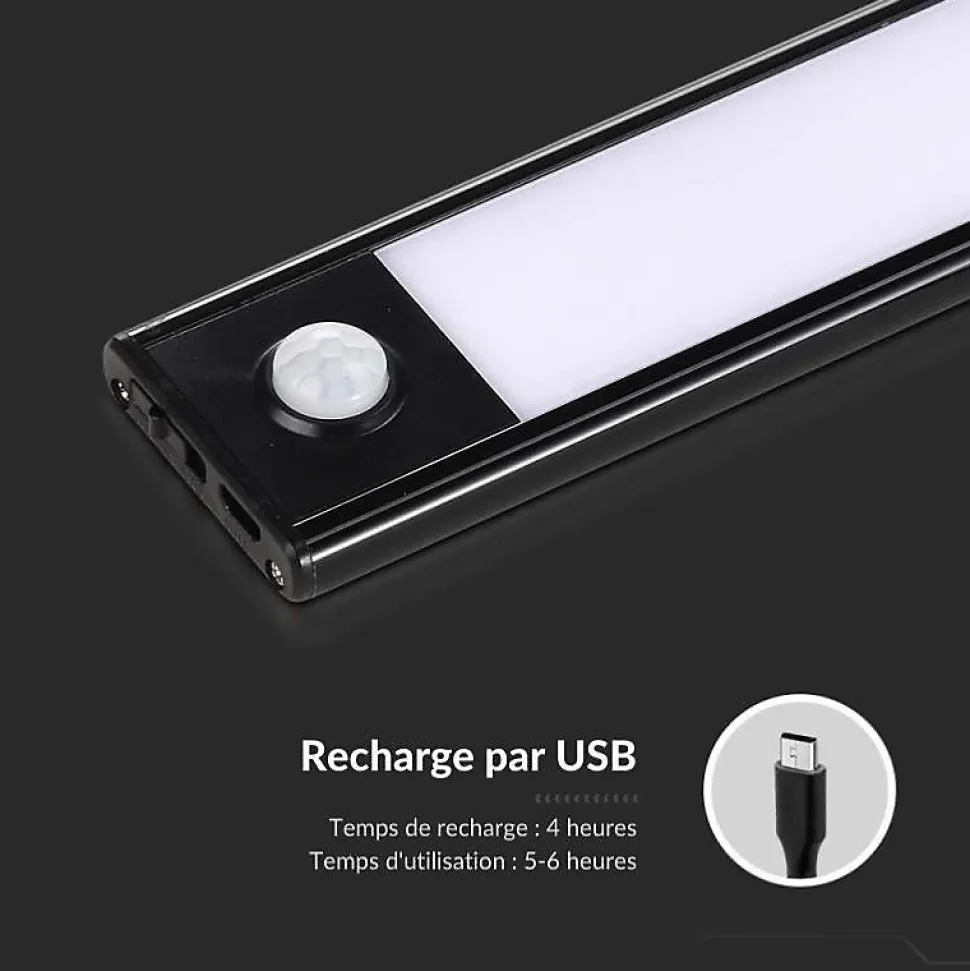 La réglette LED USB 40 cm noire avec capteur de mouvement offre une solution d’éclairage d’appoint pratique, discrète et autonome. Rechargeable, sans fil, elle s’adapte parfaitement aux petits espaces : placards, escaliers, dessous de meubles… avec un déclenchement automatique à chaque passage.Détails techniques de la réglette LED 40 cm rechargeable avec détectionPuissance : 2W, consommation très faible.Flux lumineux : 160 lumens, rendement de 80 lm/W.Détecteur de mouvement intégré : activation sans contact.Autonomie : 5 à 6 heures d’utilisation continue.Temps de charge : 4 heures via USB (câble fourni).Modes disponibles : ON (fixe), AUTO (détection), OFF (éteint).Dimensions : 40 x 9 x 0,4 cm, format plat et discret.Alimentation : batterie interne rechargeable, 5V USB.Courant : 400 mAh.Indice de protection : IP20, usage intérieur exclusivement.IRC : Ra 80, rendu fidèle des couleurs.Classe énergétique : G.Matériau : aluminium, finition noire élégante et résistante.Fixation : bande adhésive intégrée pour pose rapide.Certification : CE & RoHS.Garantie : 2 ans.Les avantages pratiques de cette réglette LED noire 40 cmCette réglette LED rechargeable avec détecteur de mouvement combine design ultra fin, facilité d’installation et autonomie performante. Grâce à son adhésif intégré, elle se fixe sans outil ni câ