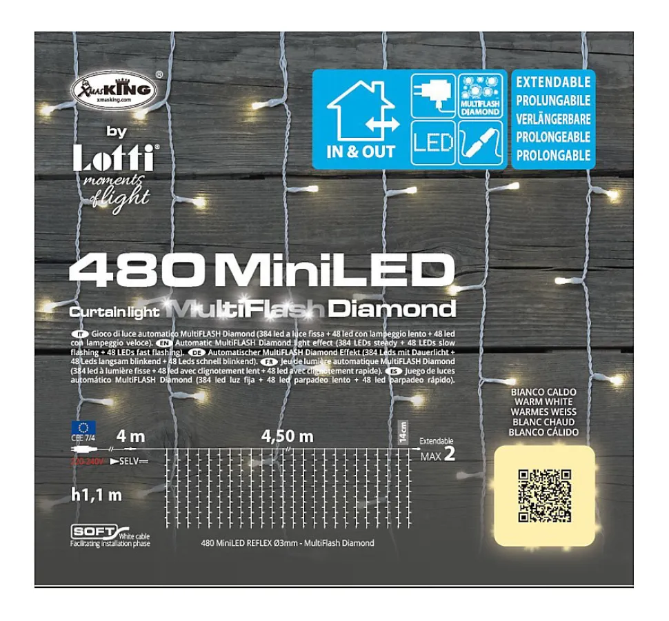 Les caractéristiques techniquesCette guirlande lumineuse peut être installée aussi bien à l’intérieur qu’à l’extérieur grâce à son coefficient d’étanchéité IP44.Elle est chaînable, vous pourrez donc en raccorder 2 en ligne, soit une longueur totale de 9 mètres.Elle est composée de 480 mini leds qui diffusent une lumière blanc chaud.La fonction multiflash automatique se décline en 384 Leds fixes de qualité professionnelle, 48 flashes rapides et 48 flashes lents.Le câble de raccordement mesure 4 mètres de long et le rideau lumineux lui-même 4,5 mètres de long sur 1,10 mètre de haut.Cet élément décoratif est également économique : à titre d’exemples une guirlande de 500 Leds allumée 10 heures par jour vous coûtera 60 centimes par mois.Les avantages esthétiques Ce rideau lumineux décoratif embellira aussi bien votre intérieur que votre extérieur car il est étanche.Sa fonction multiflash permet un éclairage dynamique et esthétique qui attirera l’oeil des passants et clients.Pour les fêtes de fin d’année, il participera à la décoration festive de votre intérieur, extérieur ou magasin.La possibilité de raccorder 2 rideaux lumineux vous offrira 9 mètres d’éclairage décoratif.