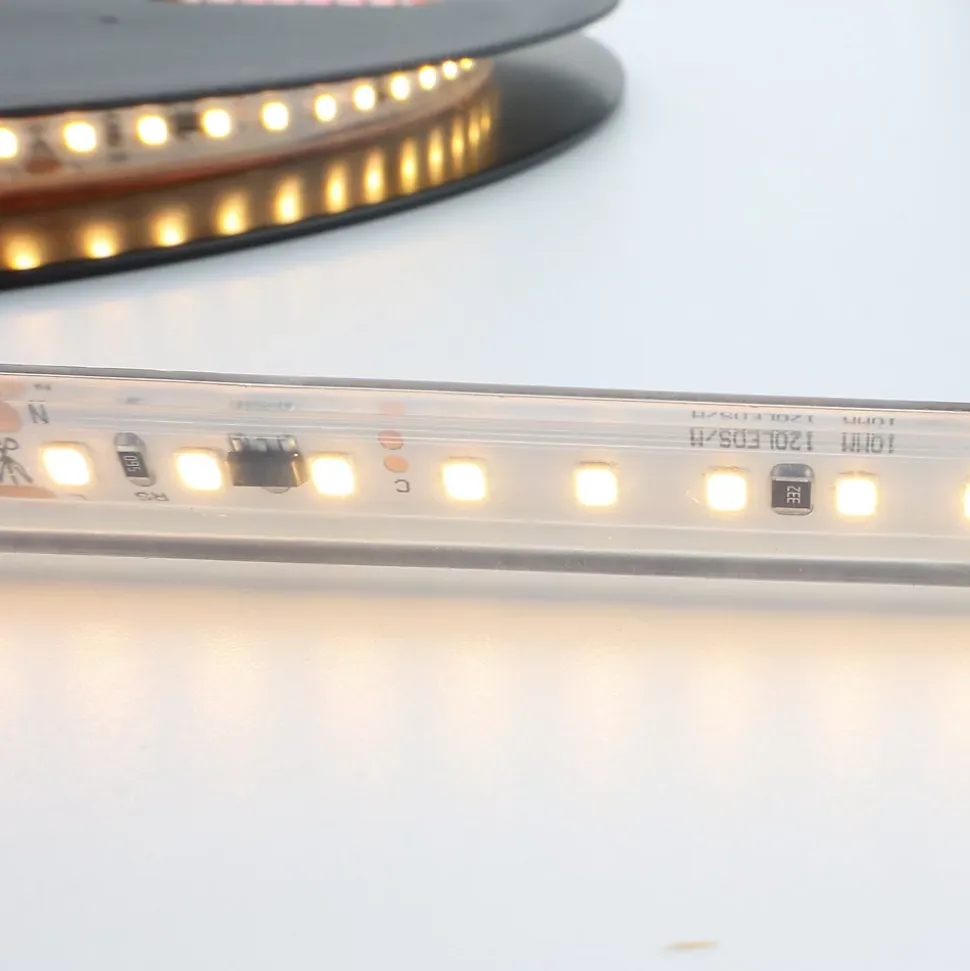 La bande LED 220V directe sur secteur offre un éclairage puissant et polyvalent pour l’extérieur et l’intérieur, avec une puissance totale de 75W et une intensité lumineuse de 8 625 lumens. Avec des puces SMD2835 de haute qualité et 120 LEDs par mètre, cette bande se distingue par son design fin de 12 mm et son indice de protection IP67, la rendant résistante à l’humidité, à la pluie et à la poussière. Ce qui distingue cette bande, c’est sa facilité d’installation, avec des coupes tous les 100 mm et sans besoin de redresseur. Son revêtement en silicone la rend complètement flexible et adaptée aux conditions climatiques extrêmes. Elle offre une large gamme d’options de température de couleur, allant du blanc chaud au blanc froid. Avec un indice de rendu des couleurs élevé (IRC >80), cette bande LED permet une visualisation précise des couleurs. Elle est pré-montée en rouleau de 5 mètres avec des connecteurs de début et de fin, facilitant sa manipulation et son placement. Fonctionne directement à 220V sans besoin de drivers ou de transformateurs supplémentaires. Idéale pour un éclairage général à l’extérieur, les vitrines, les présentoirs, la décoration intérieure, architecturale et pour mettre en valeur des objets et des environnements. Avec un angle d’ouverture de 180 degrés et une distance de coupe de 100 mm, cette bande LED offre une solution polyvalente et efficace pour diverses applications. Caractéristiques : Puissance : 75W (15W/m) Intensité lumineuse : 8 625 lumens Puce LED : SMD2835 Indice de protection : IP67 Revêtement en silicone pour flexibilité et protection Facilité d’installation avec coupes tous les 100 mm Large gamme de températures de couleur Haute reproduction chromatique (IRC >80) Fonctionne directement à 220V Idéale pour un éclairage général et décoratif à l’intérieur et à l’extérieur