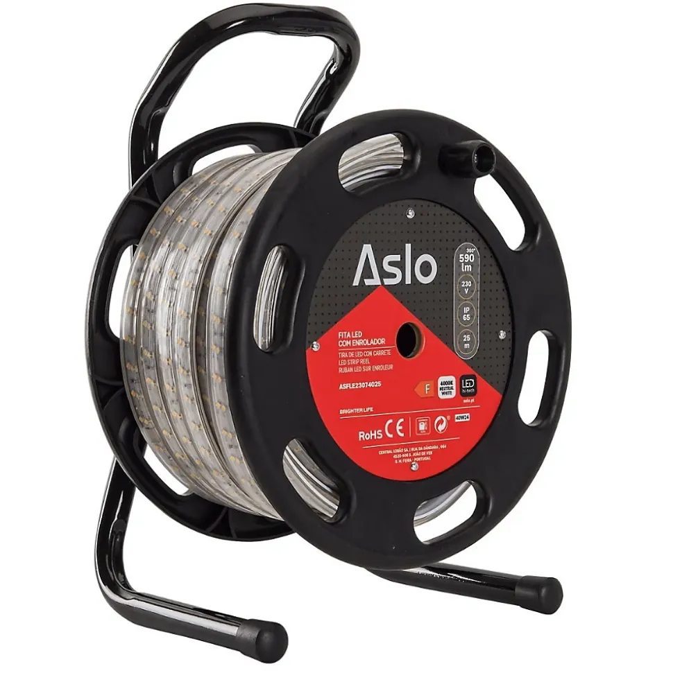 Ruban LED 25m 7W sur Enrouleur ASLO – Guirlande Lumineuse Blanche 4000K pour Intérieur, Extérieur, Façade Maison Evènement, Festivals Flux lumineux : 590 Lm/m360 soit 14750 Lm. Température de couleur : 4000K – blanc neutre. Angle d’éclairage : 120°. Indice de protection IP65 résitant à l’eau/poussière. 230V AC | 50-60Hz. – Dimensions enrouleur : H 38 cm x Prof. 21,5 cm. Classe d’isolation : II