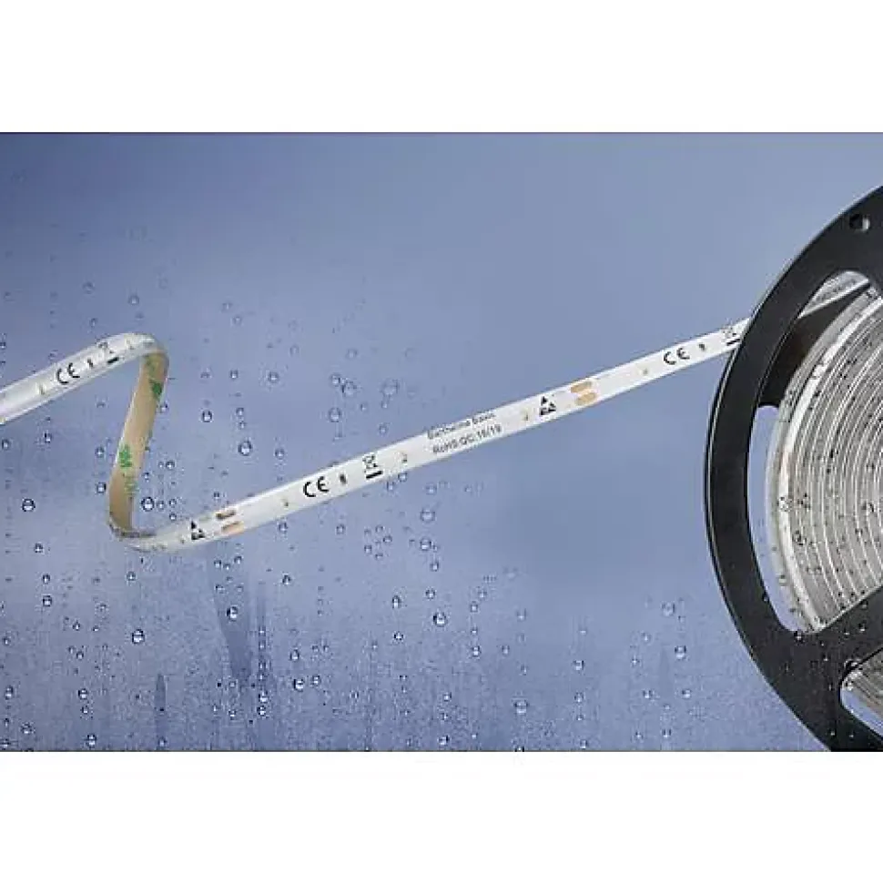 Ruban LED BASIC IP54 5 m, 30 LED/mètre, blanc froid 4000 K, CRI 90, consommation 12 W au total (2,4 W/m), dimmable, sectionnable tous les 10 cm, protection IP54 contre l’eau et la poussière, longueur divisible en unités de 100 mm avec 3 LED par section.