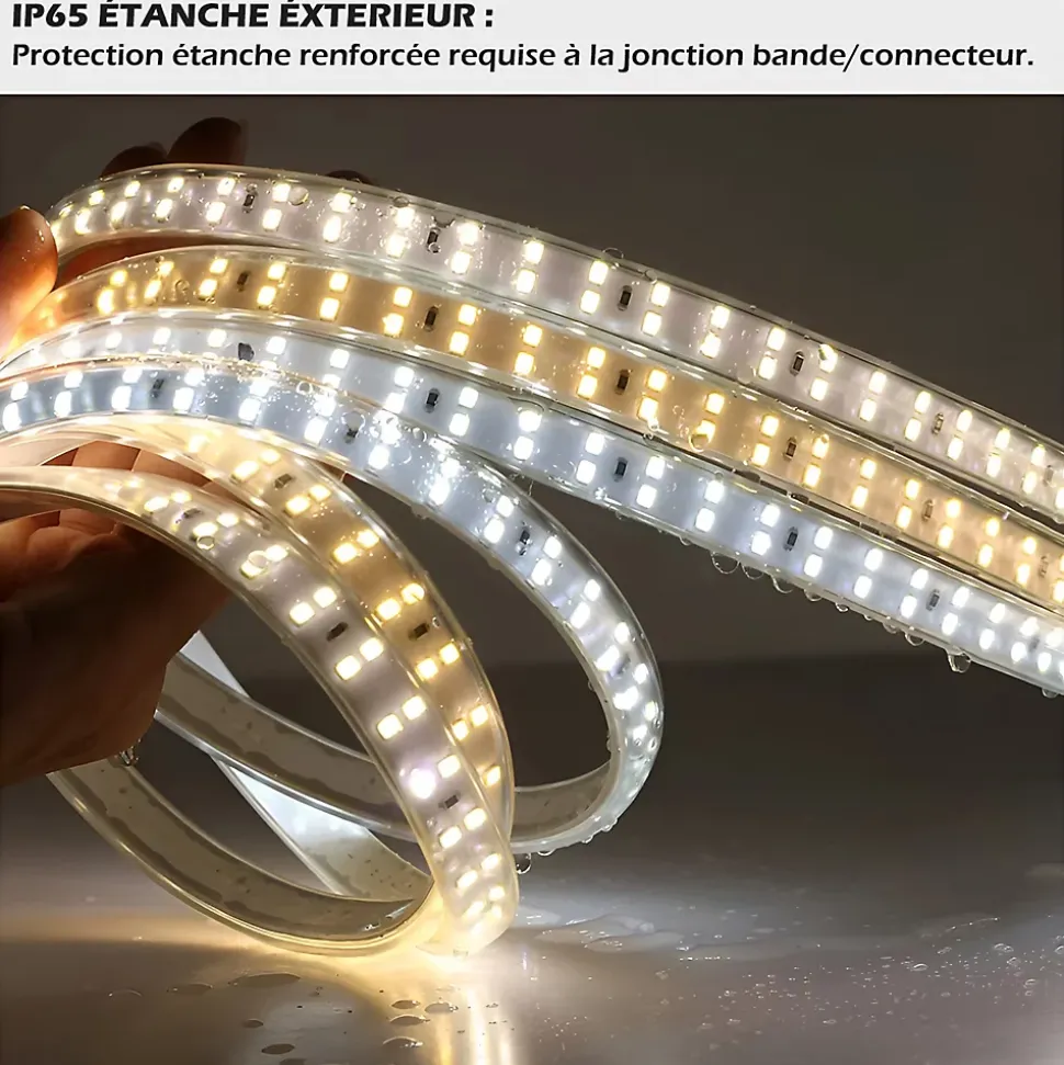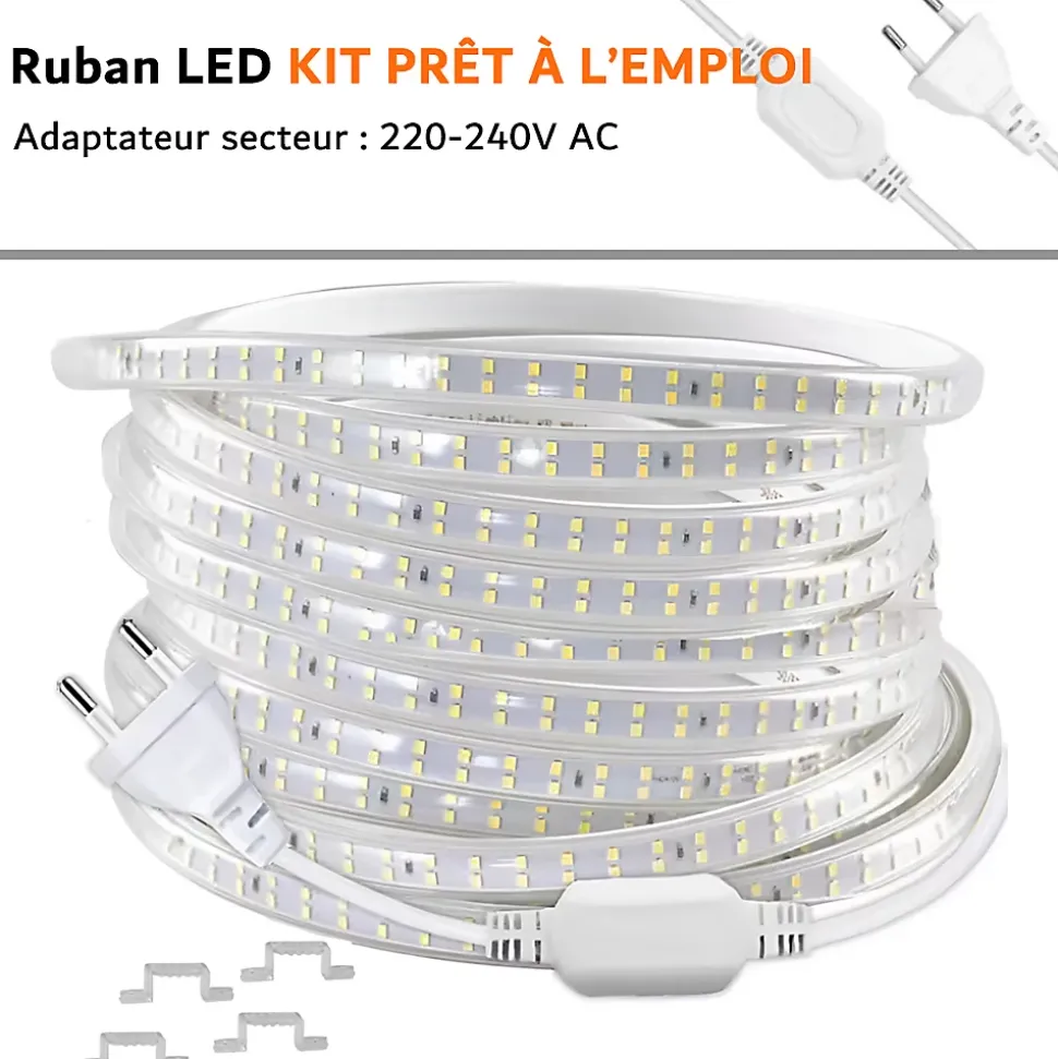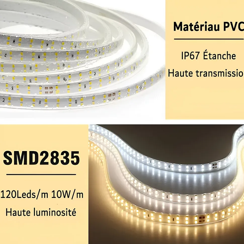 Accessoires : 1 x Connecteur d’alimentation Prise 230V, 1 x Embout de finition, 150 x Fixation Support (3pcs/M)Température de lumière : 3000KCapacité de longeur : 50MPuissance nominale : 11W/MFlux lumineux : 1260Lm/MQuantité de LEDs par mètre : 120Leds/MTension nominale : AC 230VType LED : SMD2835Dimensions : 13mmDurée de vie : 30 000hIndice de protection : IP67IRC : >80RaTemps d’allumage : InstantanéMatériaux : PCB/époxyTempérature de stockage : -5°C à 30°CAngle de diffusion : 120°Garantie : 2 ans