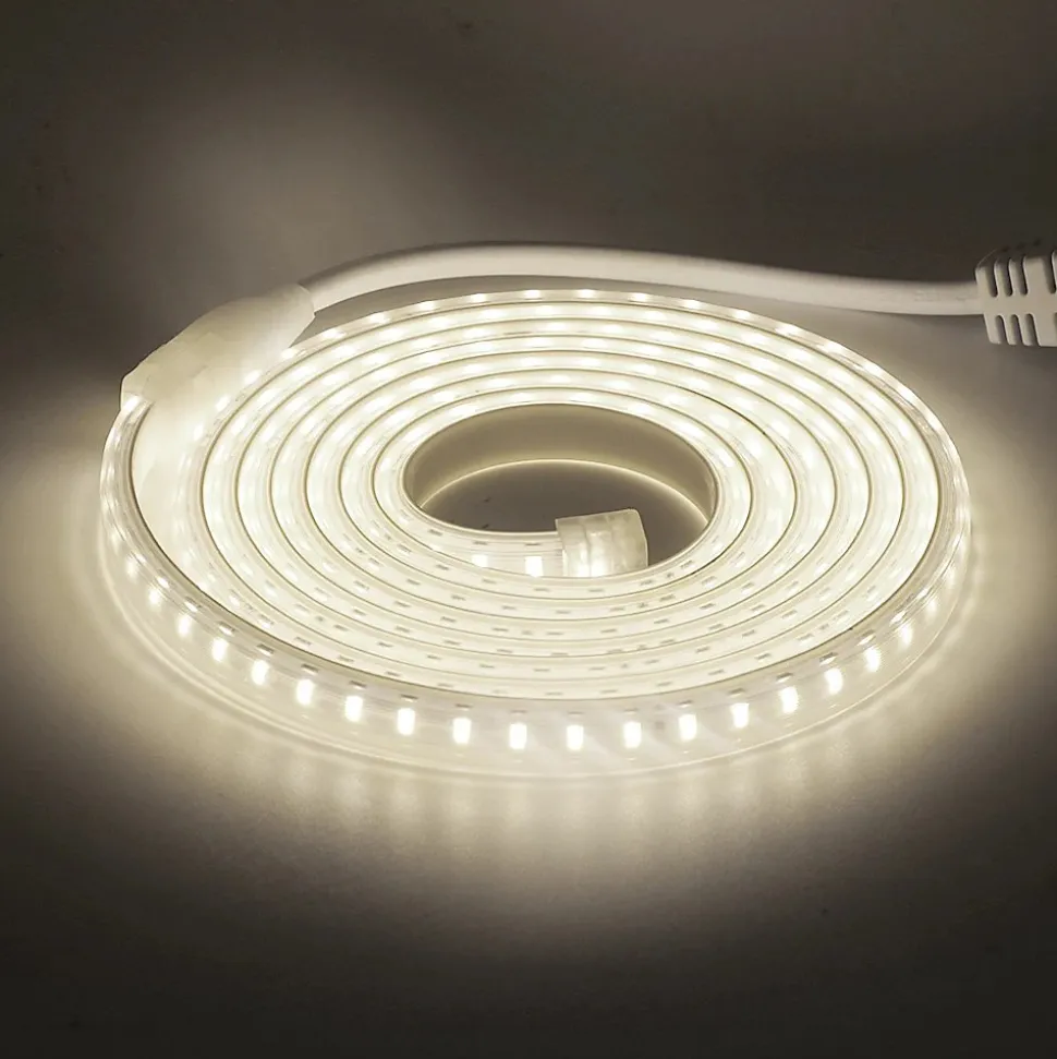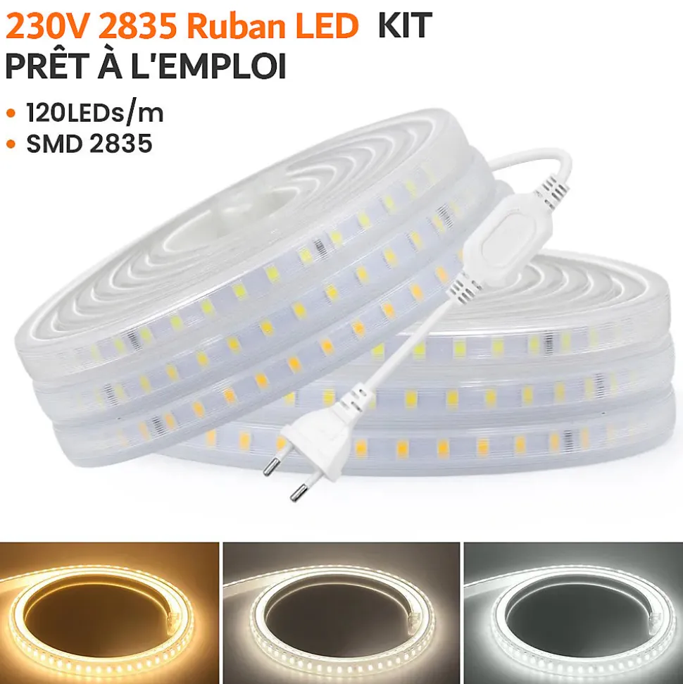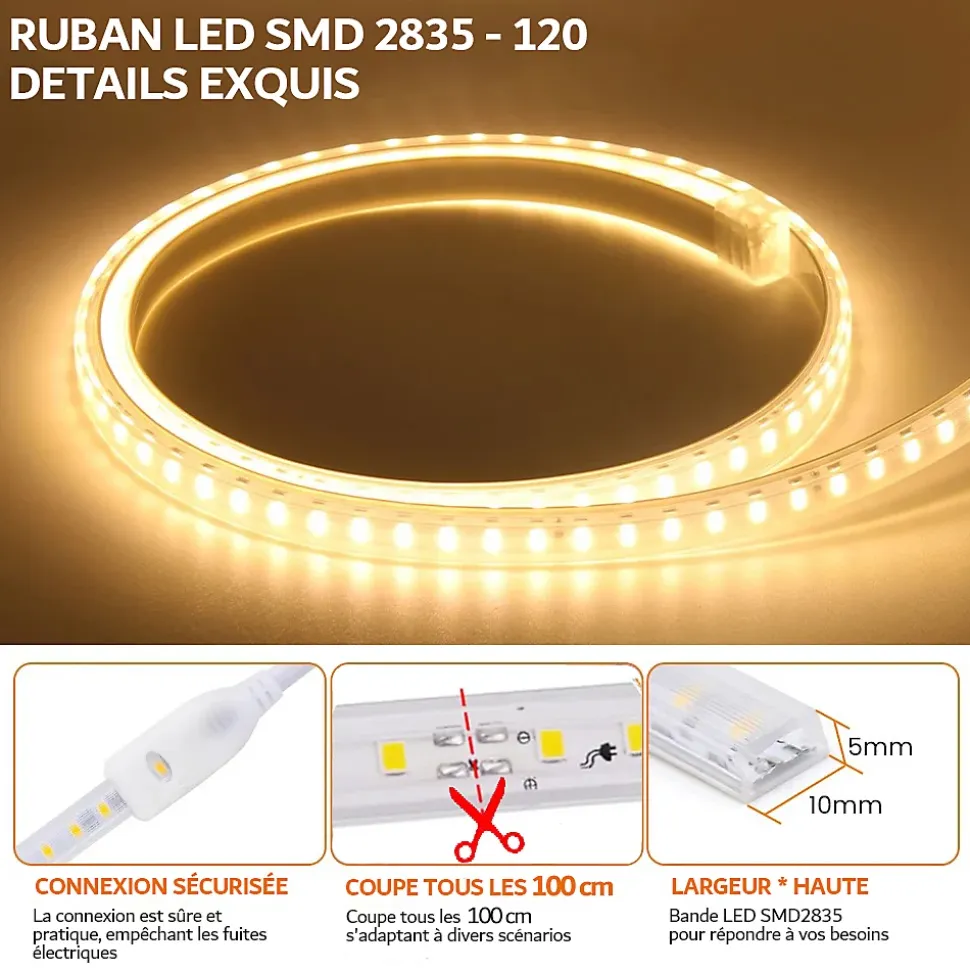 Accessoires : 1 x Connecteur d’alimentation Prise 230V, 1 x Embout de finition, 150 x Fixation Support (3pcs/M) Capacité de longeur : 50MPuissance nominale : 14.4W/MFlux lumineux : 1000LmQuantité de LEDs par mètre : 120Leds/MTension nominale : AC 220VPuissance individuel : 0.24WType LED : SMD2835 – 16Lm/LEDDimensions : 13mmDurée de vie : 30 000hIndice de protection : IP67IRC : >80RaTemps d’allumage : InstantanéMatériaux : PCB/époxyGarantie : 2 ansTempérature de stockage : -5°C à 30°CAngle de diffusion : 120°