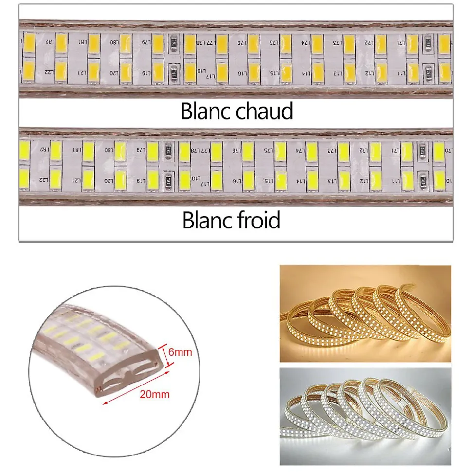 Accessoires : 1 x Connecteur d’alimentation Prise 230V, 1 x Embout de finition, 150 x Fixation Support (3pcs/M)Température de lumière : 6000KCapacité de longeur : 50MPuissance nominale : 15W/MFlux lumineux : 1650Lm/MQuantité de LEDs par mètre : 180Leds/M Tension nominale : AC 230VType LED : SMD2835Dimensions : 13mmDurée de vie : 30 000hIndice de protection : IP67IRC : >80RaTemps d’allumage : InstantanéMatériaux : PCB/époxyTempérature de stockage : -5°C à 30°CAngle de diffusion : 120°Garantie : 2 ans