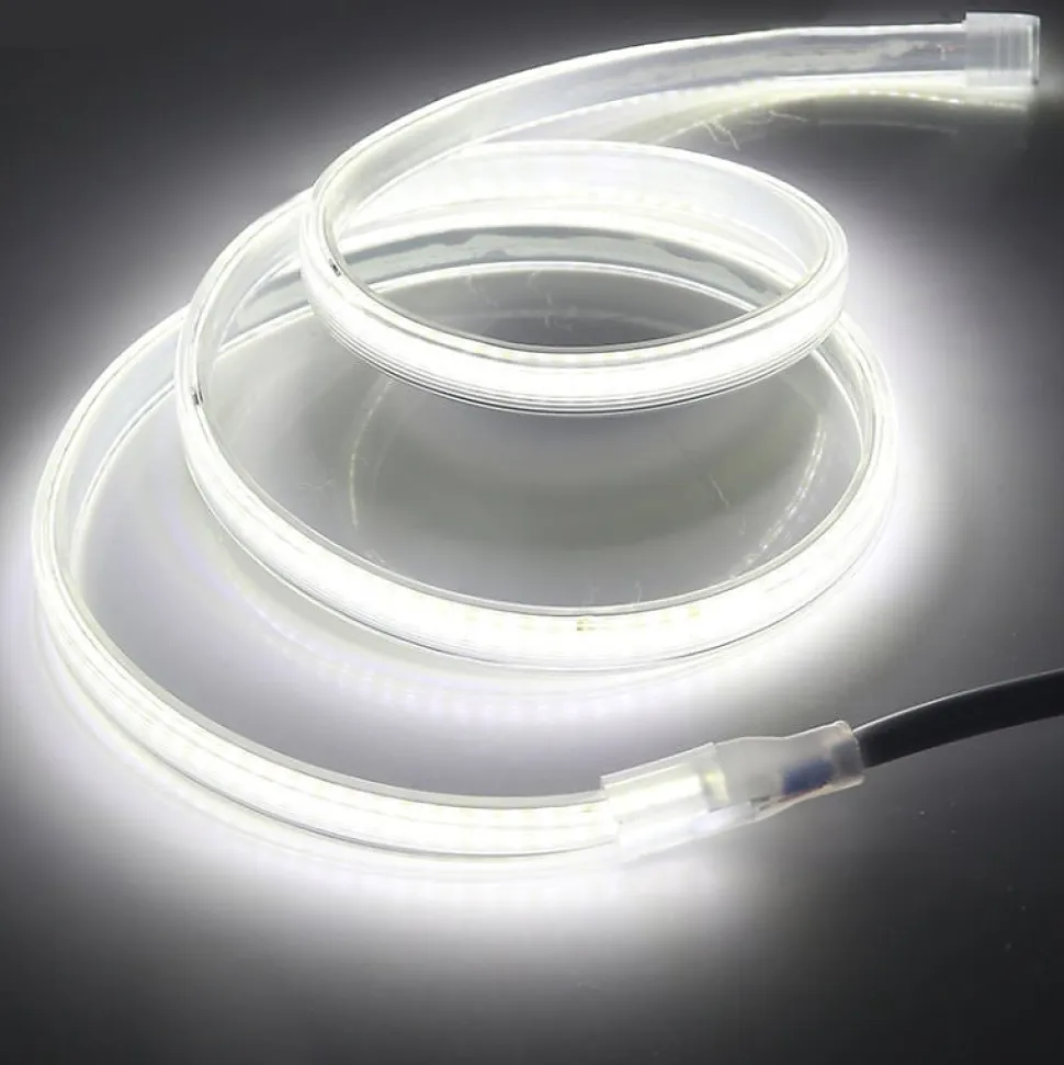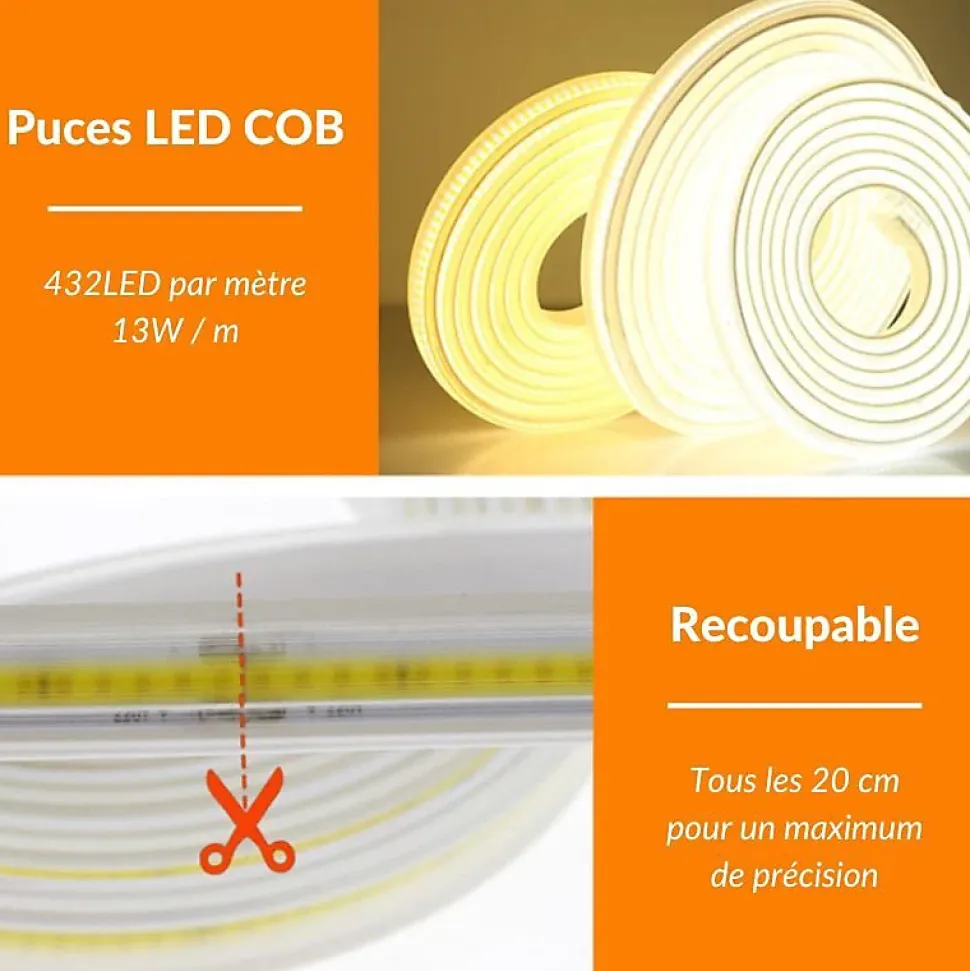 Offrez un éclairage continu, puissant et sur mesure avec ce ruban LED COB 220V IP65, vendu à la coupe par mètre. Grâce à sa haute densité de LED (432/m) et à sa protection IP65, il est idéal pour les projets extérieurs ou les zones humides.Fiche technique du ruban LED COB 220V vendu au mètreVendu au mètre linéaire : longueur sur mesure.Consommation : 13W par mètre.Flux lumineux : 1200 lm/m.Rendement : 92 lm/W.Technologie : COB, 432 LED/m, éclairage uniforme.Angle de diffusion : 120°.Tension : 220-240V AC.Indice de protection : IP65, résistant à l’eau et à la poussière.Température de fonctionnement : -20°C à +60°C.Recoupable tous les : 15 cm.Dimensions : 1,1 cm (largeur) x 0,55 cm (épaisseur).IRC : ≥ 80.Dimmable : oui, compatible variateur 220V.Durée de vie estimée : ~25 000h.Certifications : CE & RoHS.Garantie : 2 ans.Pourquoi choisir ce ruban LED 220V COB étanche ?Le ruban LED COB 220V offre une excellente solution pour des installations continues sans alimentation intermédiaire. Grâce à ses 432 LED par mètre, il garantit un rendu lumineux homogène, sans effet de points. Son alimentation directe en 220V simplifie l’installation sur de longues distances. De plus, son indice IP65 permet une utilisation en extérieur ou dans des pièces humides comme une salle de bain ou une cuisine. Il est recoupable tous les 15 cm,