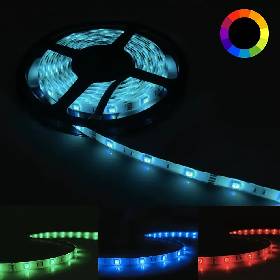 - Optez pour ce joli Ruban LED RGB 12V 5M 5050 IP44 30LED/m à brancher à l’aide d’un transformateur 220V 12V DC et contrôleur RGB, afin d’illuminer votre intérieur efficacement.