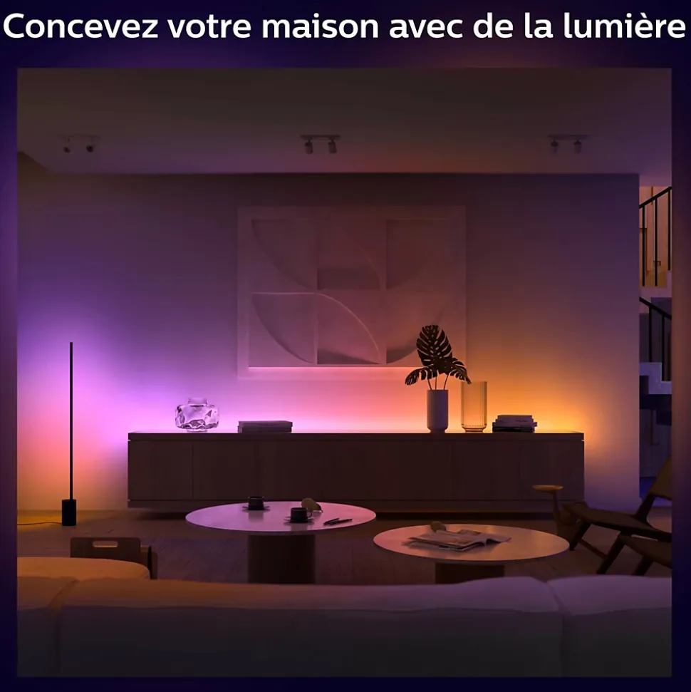 Apportez une touche lumineuse unique à chaque pièce de votre maison avec la bande LED Hue. Grâce à sa couverture transparente, elle est protégée contre la poussière et les dommages, tout en offrant des accents lumineux saisissants. Profitez d’une palette exceptionnelle de 16 millions de couleurs et de nuances de blanc chaud à blanc froid, réglables et dimmables individuellement, pour créer l’ambiance parfaite à chaque moment. Flexible et modulable, cette bande s’adapte à tous vos espaces : sous les meubles, derrière une niche ou autour de votre télévision, vous pouvez la plier, la découper et l’agrandir selon vos envies. Pour une gestion connectée complète, associez-la au pont Hue Bridge (vendu séparément) et contrôlez vos éclairages où que vous soyez. Facile à installer grâce à son adhésif intégré, elle se fixe rapidement sur toutes surfaces planes et solides, avec alimentation et connecteur d’extension inclus pour encore plus de possibilités. Illuminez votre intérieur avec style et simplicité !