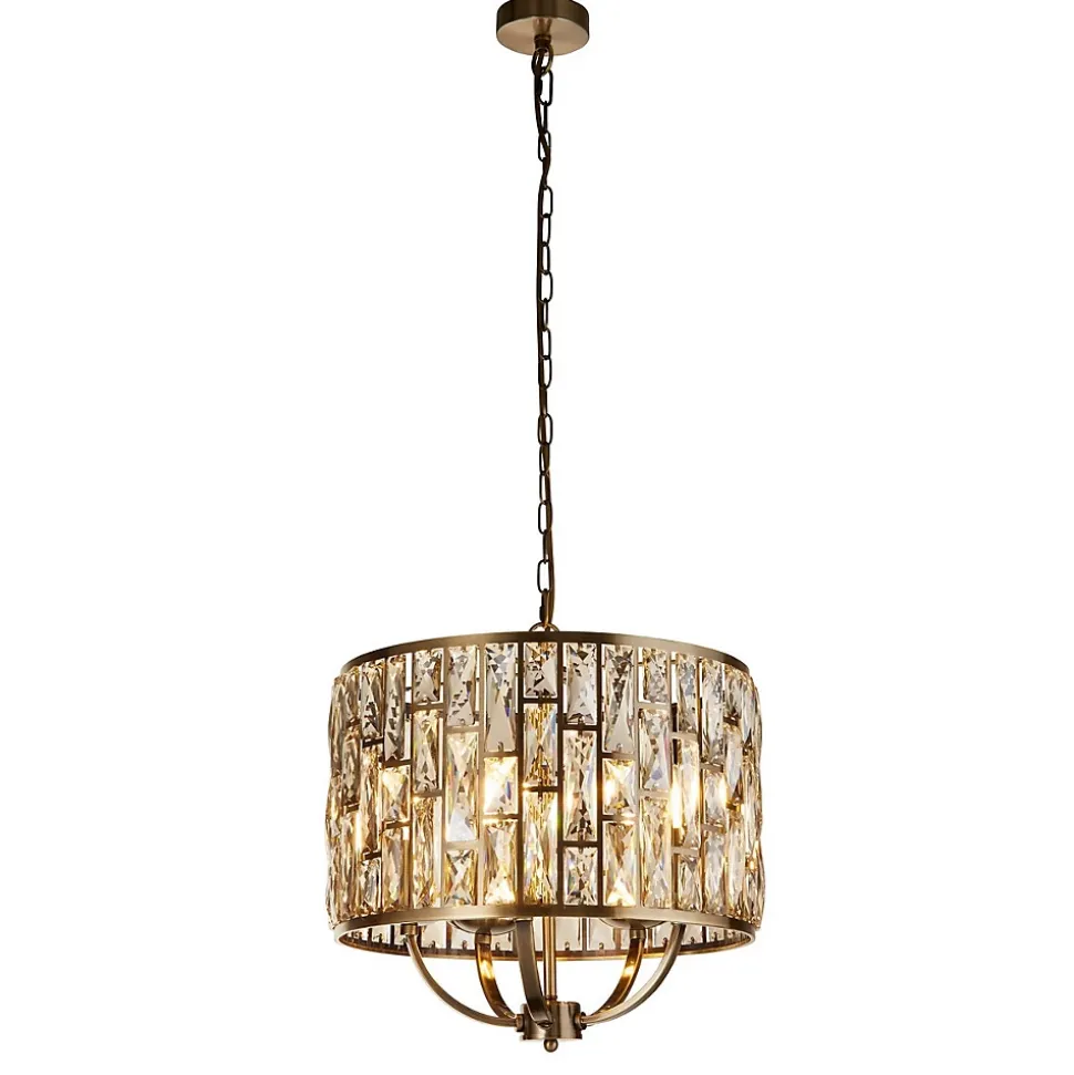 Searchlight Bijou Luminaire suspendu à 5 lumières, laiton antique, verre à champagneFinition : Laiton antiqueMatériau : acier doux et verreIndice IP : IP20Hauteur : 42,5 cmHauteur maximale : 150 cmLongueur : 44 cmLargeur : 44 cmType de lampe : E14Nombre de lampes : 5Ampoule incluse : nonIntensité variable : oui – Ampoule à intensité variable requisePoids : 7 kgPuissance (maximale) : 60 W