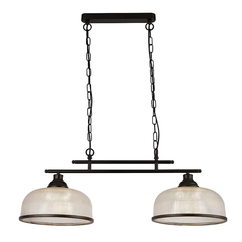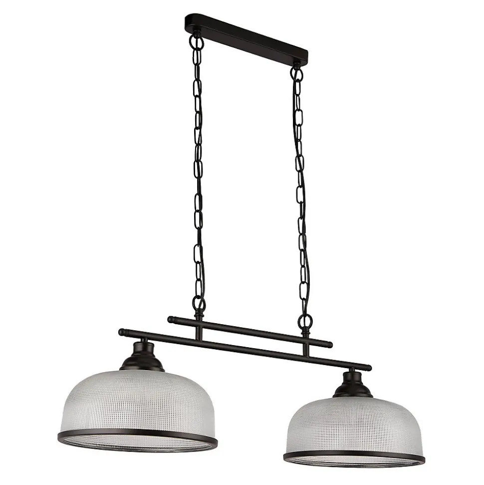 Searchlight Highworth Suspension 2 Lumières Noir, Verre Style HolophaneFinition : noir, transparentMatériau : acier doux et verreIndice IP : IP20Hauteur : 27 cmHauteur maximale : 120 cmLongueur : 75 cmLargeur : 27 cmType de lampe : E27Nombre de lampes : 2Ampoule incluse : nonIntensité variable : oui – Ampoule à intensité variable requisePoids : 5,5 kgPuissance (maximale) : 60 W