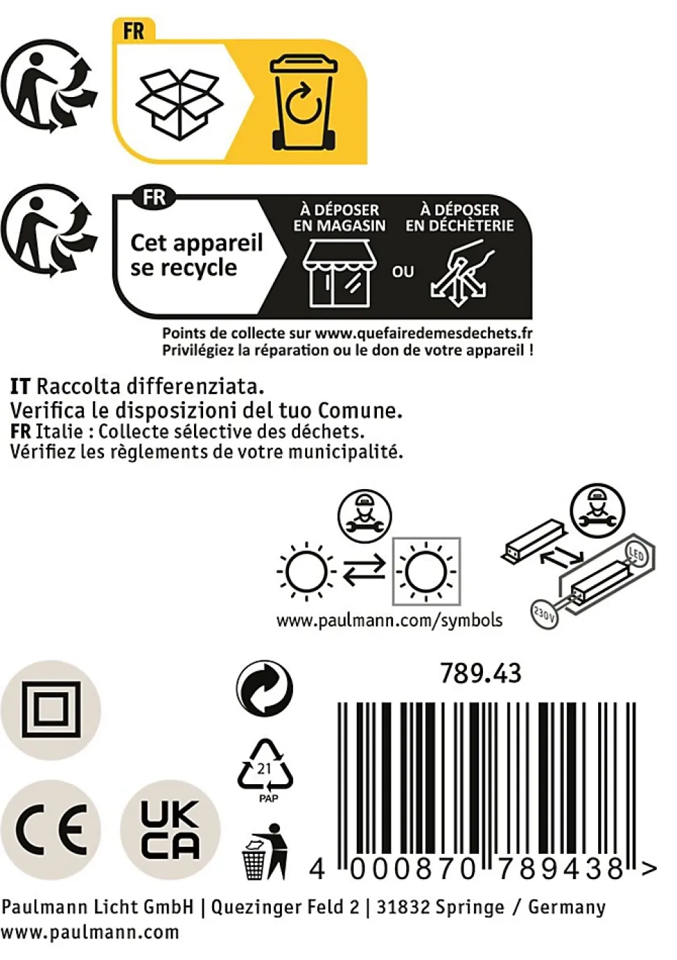 Protection IP : IP44 – Protection contre les projections d’eau|Avec ampoule LED intégrée|Whiteswitch – Diverses températures de couleur sont possibles en appuyant plusieurs fois sur l’interrupteur mural|Température de couleur: 2700K Blanc chaud – 6500K – Lumière du jour