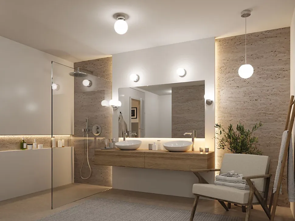 Avec sa forme sphérique intemporelle et élégante en chrome classique, le plafonnier de la série Gove assure une interaction parfaite entre lumière et design dans la salle de bains. Avec sa protection spéciale contre la pénétration de projections d’eau, ce luminaire est idéal pour une utilisation dans les pièces humides. Les luminaires de salle de bains de la série Gove sont synonymes d’élégance et de style, couplées à la technologie LED la plus moderne et la plus économe en énergie. Combinés à d’autres luminaires de la série Gove, ils créent un éclairage harmonieux dans la salle d’eau.