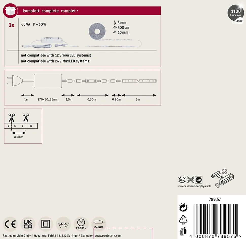 Température de couleur: 3000K – Blanc chaud|Kit prêt à l’emploi fourni avec alimentation 230/24V, câble d’alimentation et fiche secteur|Face arrière autocollante pour un montage simple|Matériel flexible pour le montage sur des surfaces planes ou courbes|Peut être raccourci en fonction de la longueur souhaitée (aux endroits marqués)|Le revêtement protège contre l’aspersion et la poussière.|Non extensible|Non compatible avec les rubans YourLED et MaxLED|Montage simple par système de connexion