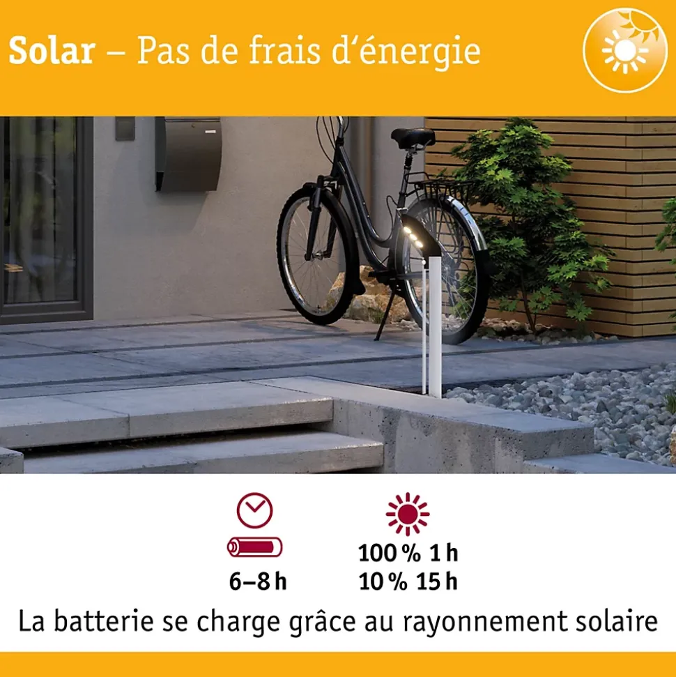 La lampe solaire Soley en anthracite apporte de la lumière à vos allées et chemins. Grâce à la technologie solaire, aucun raccordement électrique n’est nécessaire pour l’installation. Durant la journée, la batterie se recharge au soleil et dès la nuit tombée commence à briller un petit balisage que remplace une lumière fonctionnelle dès qu’une personne s’approche.
