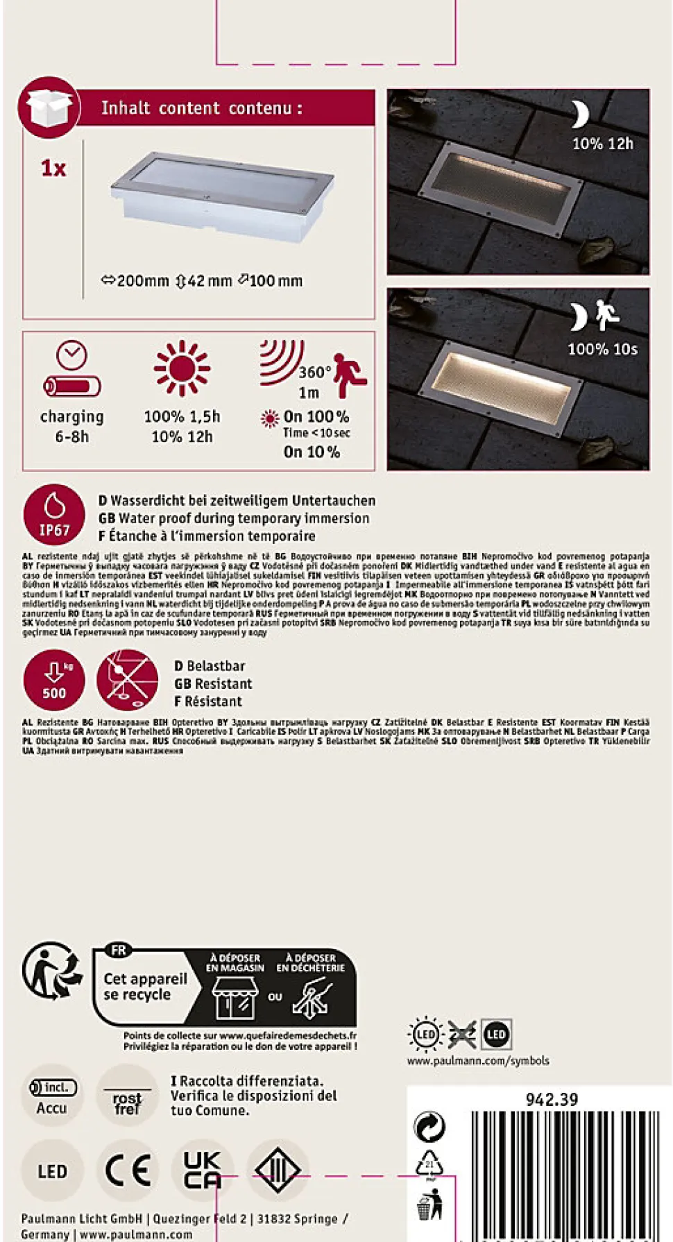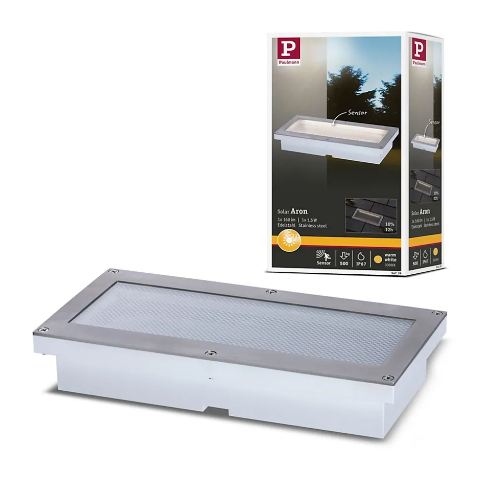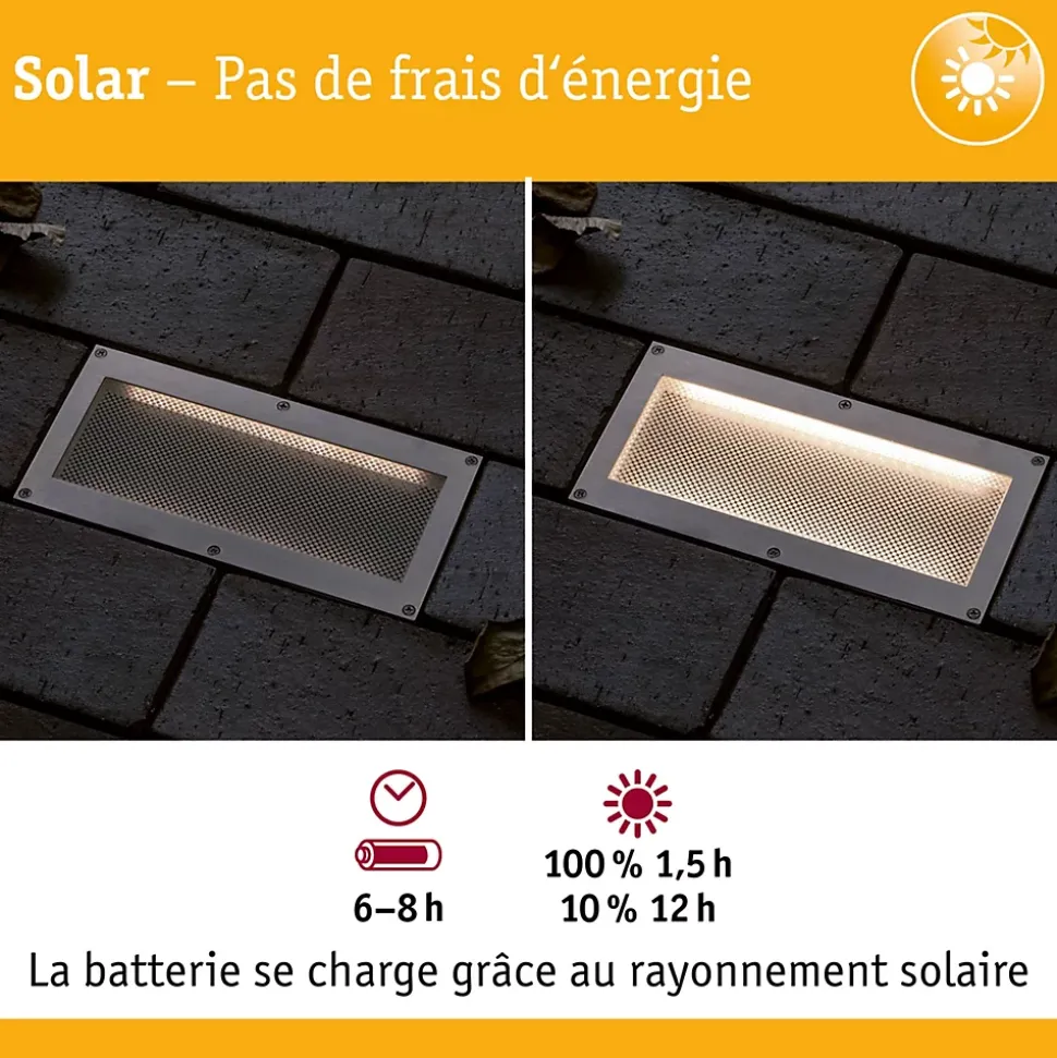 Pavés lumineux sans le moindre câble : Le luminaire encastré dans le sol solaire Aron dans les dimensions 20×10 cm se pose indépendamment de l’alimentation électrique. Durant la journée, les batteries interchangeables se rechargent au soleil et dès la nuit tombée commence à briller un balisage qui joue le rôle de lumière fonctionnelle lorsque le détecteur de mouvement signale des personnes à proximité. Placées légèrement en retrait, les cellules solaires sont quasiment invisibles, si bien que l’œil ne perçoit qu’une surface lumineuse uniforme. Cet encastré de sol est, grâce à l’indice de protection IP67, étanche et inoxydable et il est adapté aux zones accessibles en plein air – l’éclairage résiste sans problème jusqu’à un poids de 500 kg.