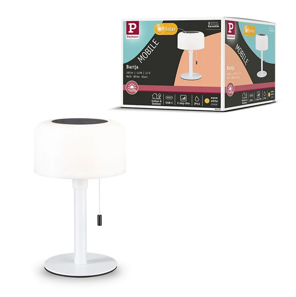 La lampe à poser LED mobile Bartja Blanc est parfaitement adaptée à l’intérieur comme à l’extérieur. Grâce à son module solaire intégré, elle peut être rechargée facilement par le soleil ou via une connexion USB-C. L’interrupteur à tirette pratique permet de faire varier l’intensité lumineuse sur trois niveaux différents, créant ainsi une possibilité d’éclairage personnalisée. Une ampoule LED intégrée de température de couleur blanc chaud 2 700 K garantit une atmosphère agréable dans toutes les pièces. La batterie peut être facilement retirée par l’utilisateur final. Avec un indice de protection IP44, cette lampe à poser est également protégée contre les projections d’eau. Le design intemporel de Bartja s’intègre harmonieusement dans tous les environnements tout en lui conférant une touche d’élégance. Que ce soit à l’intérieur ou à l’extérieur, la lampe à poser LED mobile Bartja est la solution idéale pour avoir de la lumière exactement là où vous en avez besoin.
