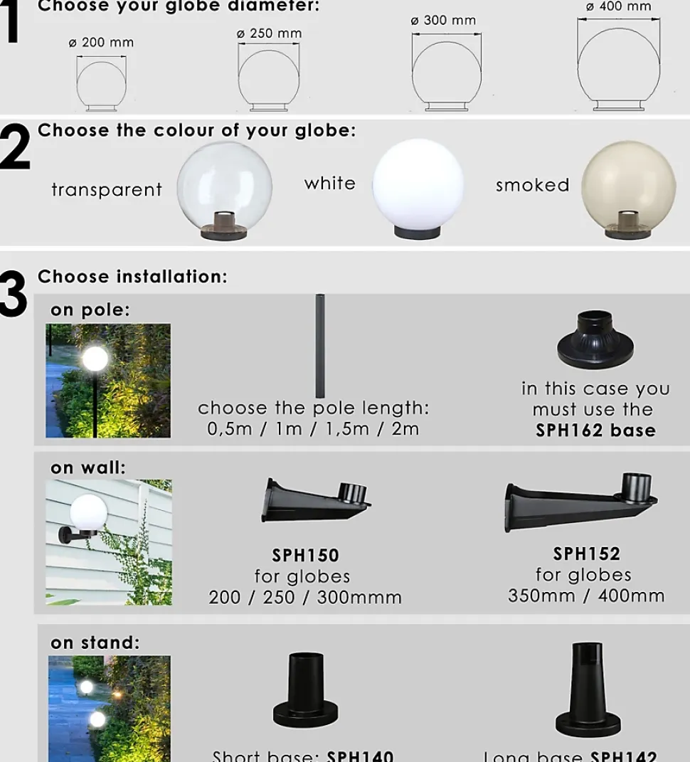 Sphère d’extérieur en PMMA, 200mm, E27, transparente