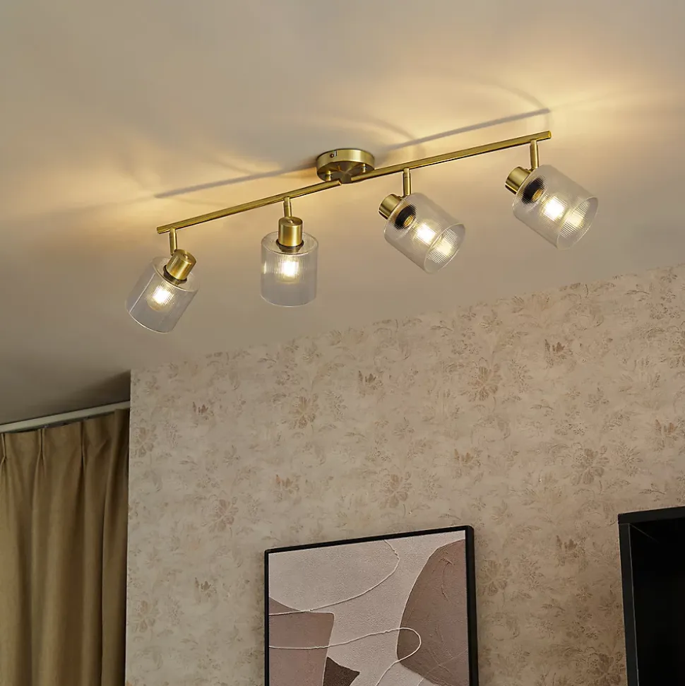 Découvrez Laura, l’impressionnant spot de plafond avec quatre points lumineux orientables. Son élégant cadre doré ajoute une touche de style à tout intérieur, en particulier dans un décor Art Déco. Les points lumineux sont entourés de verre nervuré, ce qui lui confère un look subtil et contemporain. Avec une longueur de 111 cm et une hauteur de 20 cm, Laura offre non seulement une luminosité suffisante, mais aussi un élément de design saisissant. L’achat séparé d’ampoules avec une douille E27 est nécessaire, celles-ci ne sont pas incluses de série. Laura est un choix polyvalent qui s’adapte sans effort à votre espace élégant.
