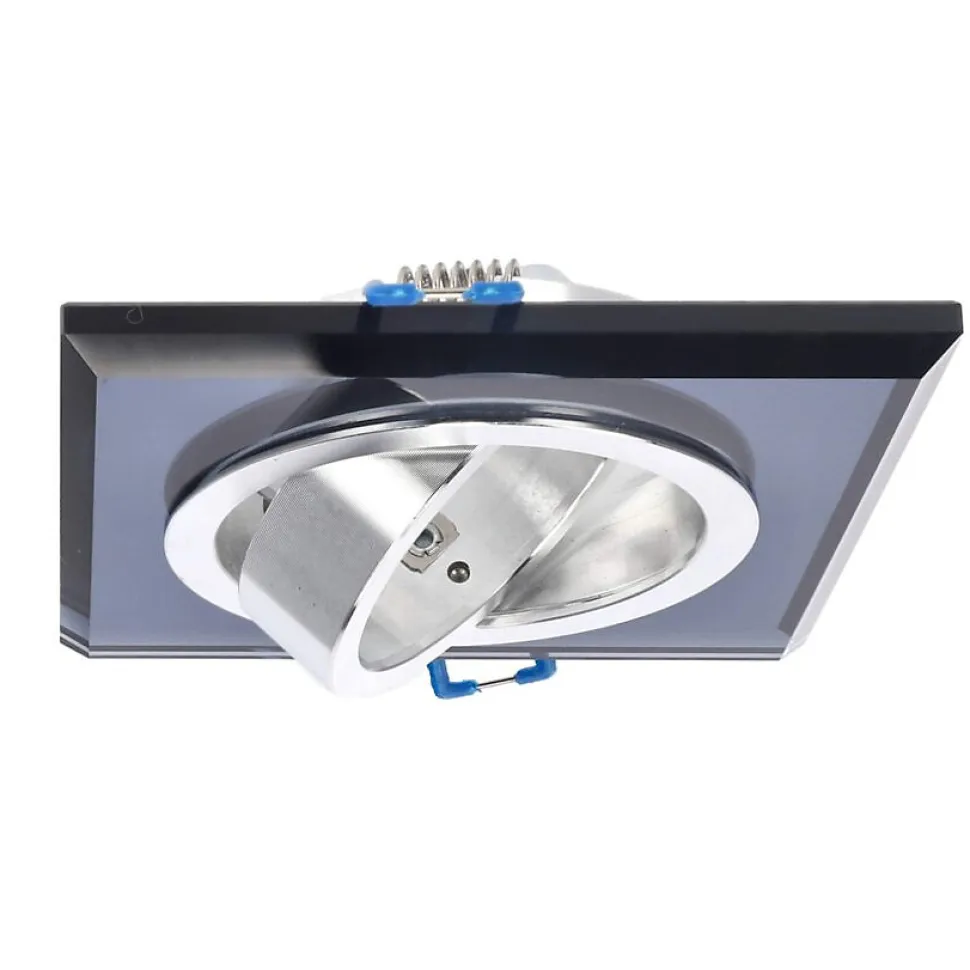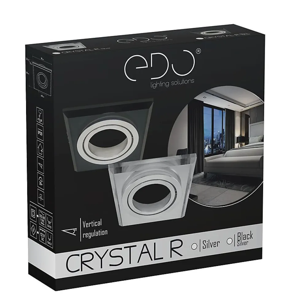 Spot encastrable au plafond CRYSTAL R Noir IP20. Carré noir moderne — spot halogène encastré. Solution encastrée fonctionnelle. Adapté aux aménagements contemporains du couloir à la cuisine comme à la chambre.Données généralesApplication : intérieurType de montage : encastréEmplacement d’installation : plafondCouleur : noir bague argentéeFinition : effet miroir bague brillanteMatériau : verre trempé aluminiumDimensions [mm] :- largeur : 96 mm- longueur : 96 mm- diamètre de l’anneau : Ø55 mm- hauteur : 10 mm- hauteur totale : 24 mm- ouverture de montage : 70–80 mmOrientable : ouiVolet : -Douille incluse : nonType de douille : GU10 / Gx5.3Nombre de douilles : 1Source lumineuse incluse : nonDonnées techniquesPuissance maximale [W] : 35 WTension nominale [V] : 220–240 V AC / 12 V DCFréquence nominale [Hz] : 50–60 HzIP : IP20Classe de protection : II / III