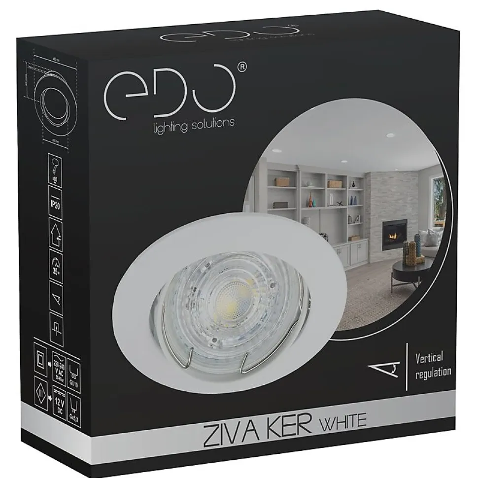 Spot encastrable au plafond orientable ZIVA KER Blanc IP20. Rond blanc moderne — spot halogène encastré. Solution fonctionnelle adaptée aux intérieurs contemporains.Données généralesApplication : intérieurType de montage : encastréEmplacement d’installation : plafondCouleur : blancFinition : mateMatériau : aluminiumDimensions [mm] :- diamètre : Ø82 mm- diamètre de l’anneau : Ø55 mm- hauteur : 2 mm- hauteur totale : 25 mm- ouverture de montage : Ø75 mmOrientable : ouiVolet : -Douille incluse : nonType de douille : GU10 / Gx5.3Nombre de douilles : 1Source lumineuse incluse : nonDonnées techniquesPuissance maximale [W] : 35 WTension nominale [V] : 220-240 V AC / 12 V DCFréquence nominale [Hz] : 50-60 HzIndice de protection (IP) : IP20Classe de protection : II / IIIContenu en mercure : nonTempérature ambiante [°C] : -20…50℃