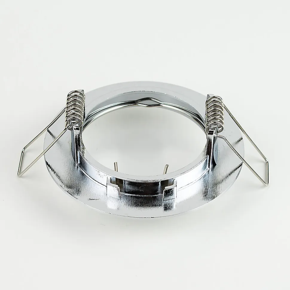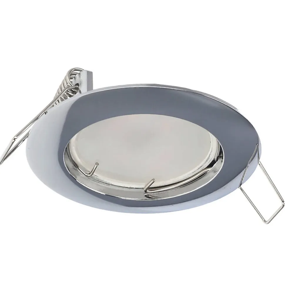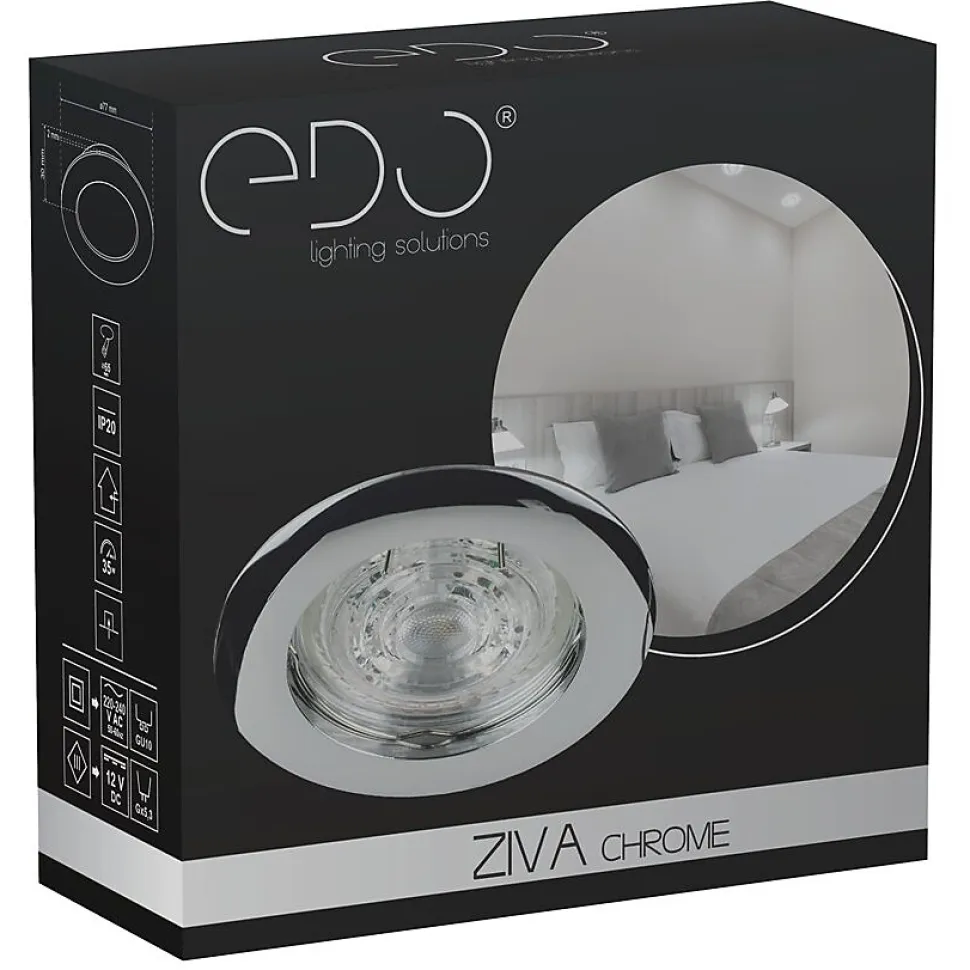 Spot encastrable au plafond ZIVA Chrome IP20. Rond chromé moderne — spot halogène encastré. Solution fonctionnelle pour couloirs cuisines et chambres.Données généralesApplication : intérieurType de montage : encastréEmplacement d’installation : plafondCouleur : chromeFinition : brillantMatériau : aluminiumDimensions [mm] :- diamètre : Ø77 mm- hauteur : 2 mm- hauteur totale : 30 mm- ouverture de montage : Ø65 mmOrientable : nonVolet : -Douille incluse : nonType de douille : GU10 / Gx5.3Nombre de douilles : 1Source lumineuse incluse : nonDonnées techniquesPuissance maximale [W] : 35 WTension nominale [V] : 220-240 V AC / 12 V DCFréquence nominale [Hz] : 50-60 HzIndice de protection (IP) : IP20Classe de protection : II / IIIContenu en mercure : nonTempérature ambiante [°C] : -20…50℃