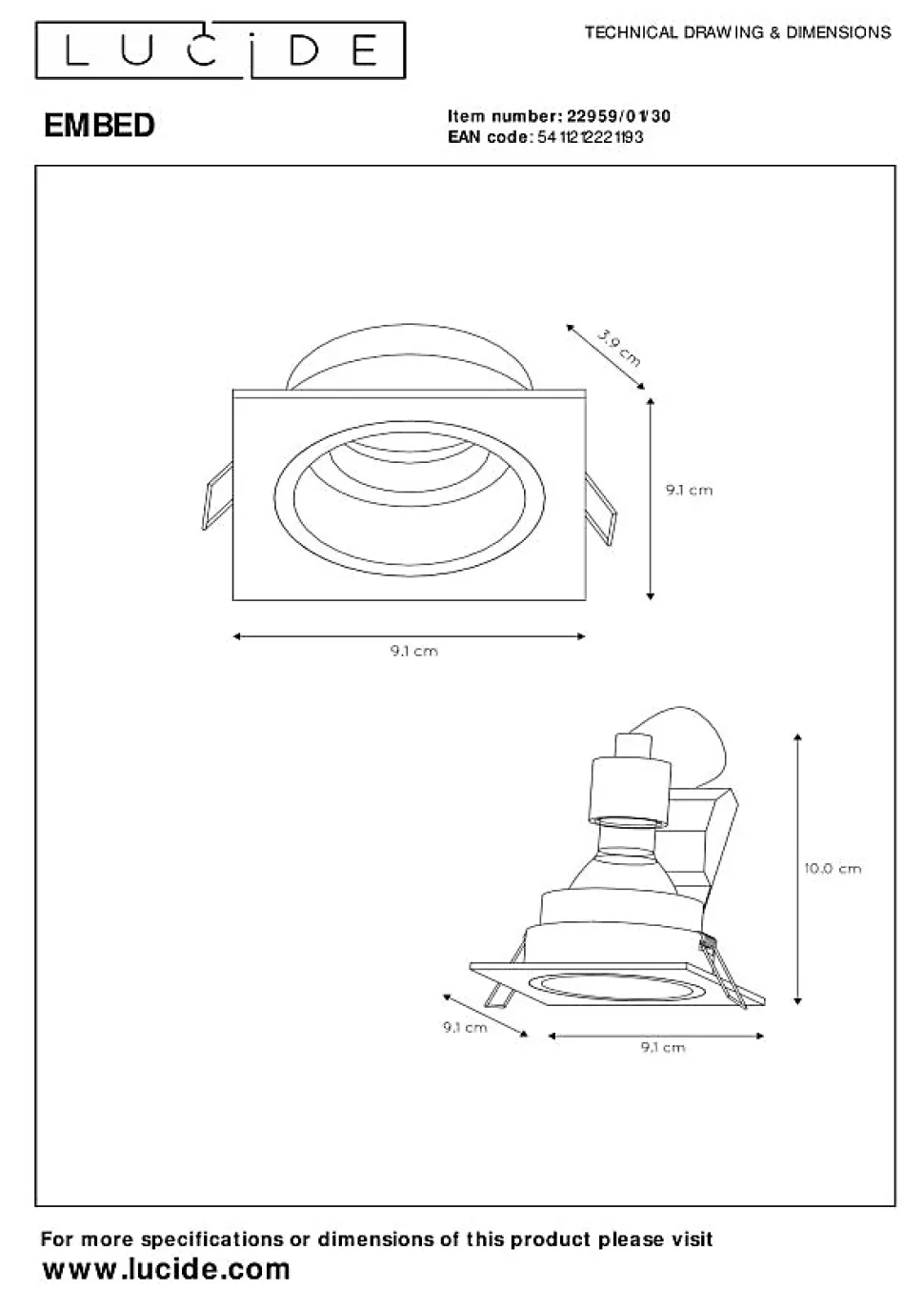 Un spot encastrable d’avant-garde carré nommé Embed. Ce spot est en aluminium de haute qualité avec une finition en laque noire mate. En combinaison avec un intérieur blanc, vous ajouterez un charme supplémentaire à votre décoration avec ce spot encastrable. Les possibilités sont infinies. Le spot est complètement orientable , vous pourrez ainsi éclairer précisément les détails que vous trouvez importants. Ce spot encastrable modern avec une douille GU10 donne le ton en matière de design et de possibilités.Caractéristiques uniques:• Utilisable avec une source lumineuse LED• Cette lampe est rotative et inclinable• Facile à connecter à un variateur (non fourni)• Fabriqué en métalPrincipales caractéristiques du produit:• Consommation énergétique: 1x50W / 230V / A intensité variable (Ampoule non incluse)• Dimensions: 8,3 cm (Diamètre de perforation) x 10 cm (Profondeur de perforation)• 2 Ans garantie sur le luminaire / source de lumière appropriée est EAN: 5411212490643Pourquoi choisir l’éclairage Lucide?Lucide incarne un design innovant, un savoir-faire artisanal et une fiabilité exemplaire. En tant qu’entreprise familiale belge avec plus de trois décennies d’expertise, nous concevons des éclairages de haute qualité qui enrichissent et transforment chaque espace, tant intérieur qu’extérieur. Notre collection polyvalente comprend des luminaires durables et des sources lumineuses économes en énergie, soigneusement conçus par nos propres experts et fabriqués selon les normes CE les plus strictes. Grâce à notre large gamme, nous vous proposons toujours une solution d’éclairage adaptée, quel que soit le style ou l’espace. Ainsi, nous illuminons non seulement votre espace de vie mais aussi votre processus de choix dans la recherche d’un éclairage de qualité et abordable. Chez Lucide, nous combinons innovation et savoir-faire pour un éclairage qui ajoute non seulement de l’ambiance, mais transf…