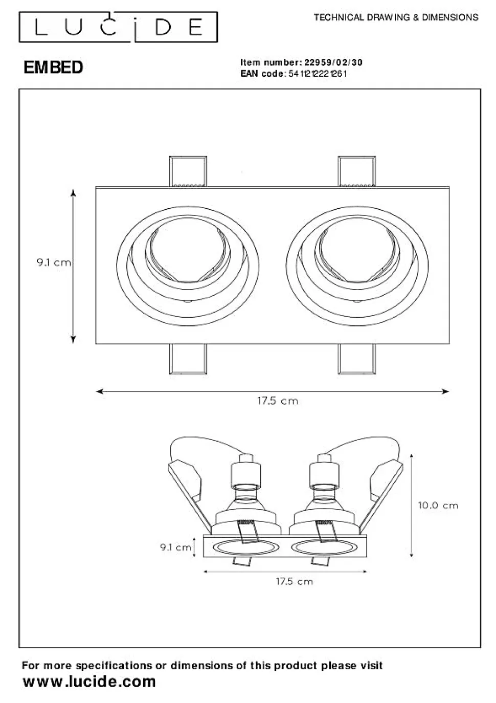 Un spot encastrable d’avant-garde rectangulaire nommé Embed. Ce spot est en aluminium de haute qualité avec une finition en laque noire mate. En combinaison avec un intérieur blanc, vous ajouterez un charme supplémentaire à votre décoration avec ce spot encastrable. Les possibilités sont infinies. Le spot est complètement orientable , vous pourrez ainsi éclairer précisément les détails que vous trouvez importants. Ce spot encastrable modern avec une douille GU10 donne le ton en matière de design et de possibilités.Caractéristiques uniques:• Utilisable avec des sources lumineuses LED• Cette lampe est rotative et inclinable• Facile à connecter à un variateur (non fourni)• Fabriqué en métalPrincipales caractéristiques du produit:• Consommation énergétique: 2x50W / 230V / A intensité variable (Ampoules non incluses)• Dimensions: 17 cm (Longueur de perforation) x 8,3 cm (Largeur de perforation) x 10 cm (Profondeur de perforation)• 2 Ans garantie sur le luminaire / source de lumière appropriée est EAN: 5411212491237Pourquoi choisir l’éclairage Lucide?Lucide incarne un design innovant, un savoir-faire artisanal et une fiabilité exemplaire. En tant qu’entreprise familiale belge avec plus de trois décennies d’expertise, nous concevons des éclairages de haute qualité qui enrichissent et transforment chaque espace, tant intérieur qu’extérieur. Notre collection polyvalente comprend des luminaires durables et des sources lumineuses économes en énergie, soigneusement conçus par nos propres experts et fabriqués selon les normes CE les plus strictes. Grâce à notre large gamme, nous vous proposons toujours une solution d’éclairage adaptée, quel que soit le style ou l’espace. Ainsi, nous illuminons non seulement votre espace de vie mais aussi votre processus de choix dans la recherche d’un éclairage de qualité et abordable. Chez Lucide, nous combinons innovation et savoir-faire pour un éclairage qui aj…