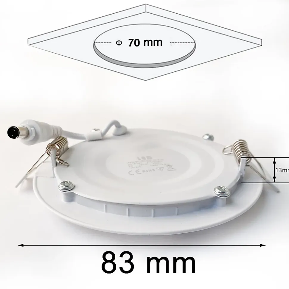 Température de couleur : Blanc Froid 6000KPuissance consommée : 5WFlux lumineux : 375 LumensDiamètre du spot : ø83*13mmDiamètre de perçage : ø70mmCouleur du produit (y compris le cadre) : BlancIndice de protection : IP 20Garantie fabricant : 2 ans