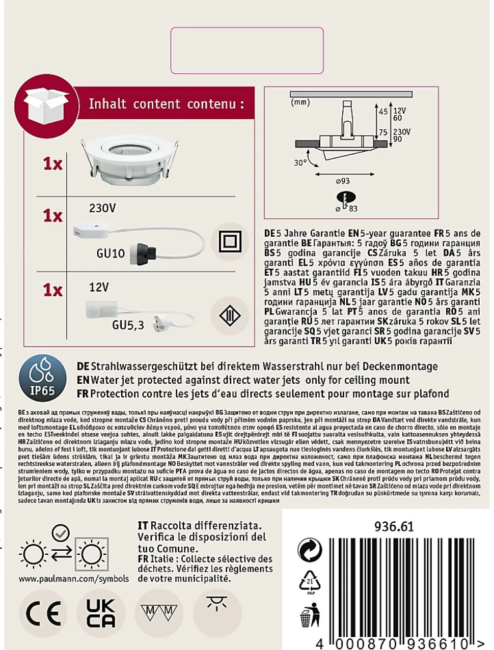Découvrez le spot encastrable Paulmann Nova, idéal pour votre salle de bains. Conçu avec un design moderne et élégant, ce luminaire s’intègre parfaitement dans les espaces humides grâce à son indice de protection IP65. Il est compatible avec les ampoules halogènes GU10 et GU5.3, offrant une puissance de 35W pour un éclairage optimal. Sa couleur blanche mate et son diamètre de montage de 83 mm en font un choix esthétique et pratique. Avec une profondeur d’encastrement de 60 mm et un poids de 399 g, il est facile à installer. Profitez d’une plage de pivotement maximale de 30° pour diriger la lumière où vous en avez besoin. Transformez votre salle de bains avec ce spot performant et design.