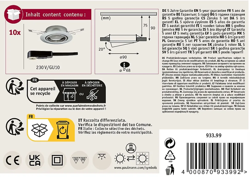 Kit de 10 luminaires|Avec des spots réglables pour un éclairage optimal|Pour raccordement direct au secteur 230V|Ne pas oublier : Commandez l’ampoule adaptée en même temps !