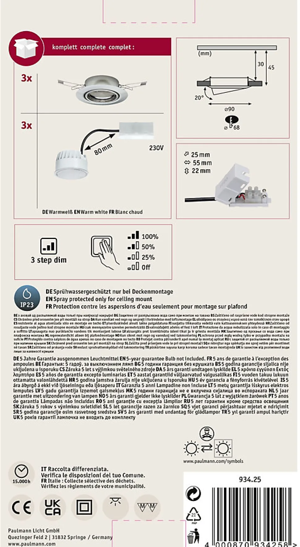 Kit de 3 luminaires|Un simple commutateur permet de faire varier la luminosité sur 3 niveaux|Ampoule LED amovible incluse|Température de couleur: 3000K – Blanc chaud|Avec des spots réglables pour un éclairage optimal|Pour raccordement direct au secteur 230V