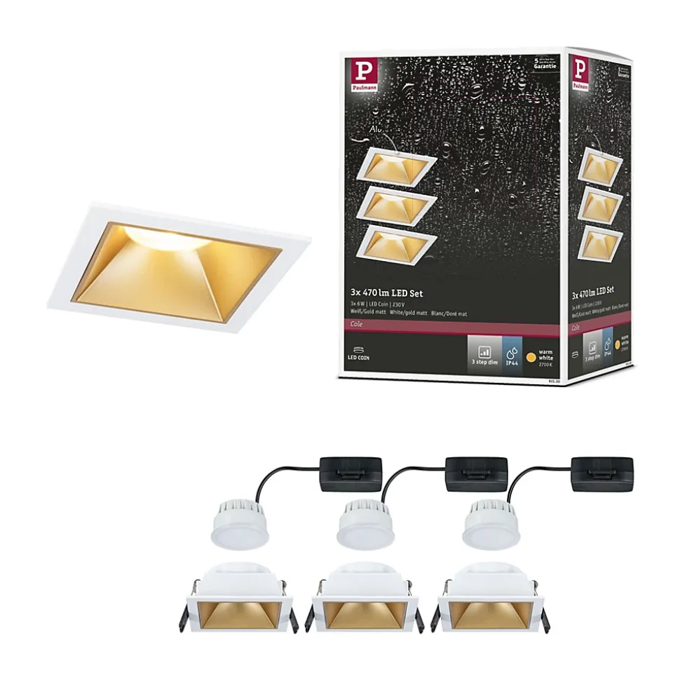 Coup de foudre clairvoyant ! Avec leurs ampoules en retrait, les spots encastrés Cole carrés en Blanc#Doré mat se fondent presque dans le plafond. Mais sitôt repérés, impossible de s’en détourner. La lumière des Coin en retrait garantit un éclairage doux et non éblouissant. De plus, ils convainquent par leur technologie brillante : Les LED Coin remplaçables diffusent une agréable lumière blanc chaud et se règlent sur trois niveaux avec un interrupteur conventionnel.