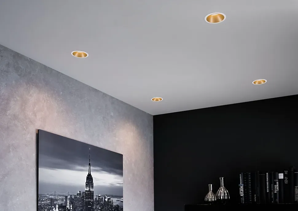 Coup de foudre clairvoyant ! Avec leurs ampoules en retrait, les six spots encastrés Cole en Blanc/Doré se fondent presque dans le plafond. Mais sitôt repérés, impossible de s’en détourner. La lumière des Coin en retrait sur la surface dorée dépolie garantit un éclairage doux et non éblouissant. De plus, ils convainquent par leur technologie brillante : Les LED Coin remplaçables diffusent une agréable lumière blanc chaud et se règlent sur trois niveaux avec un interrupteur conventionnel.
