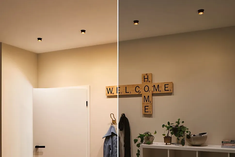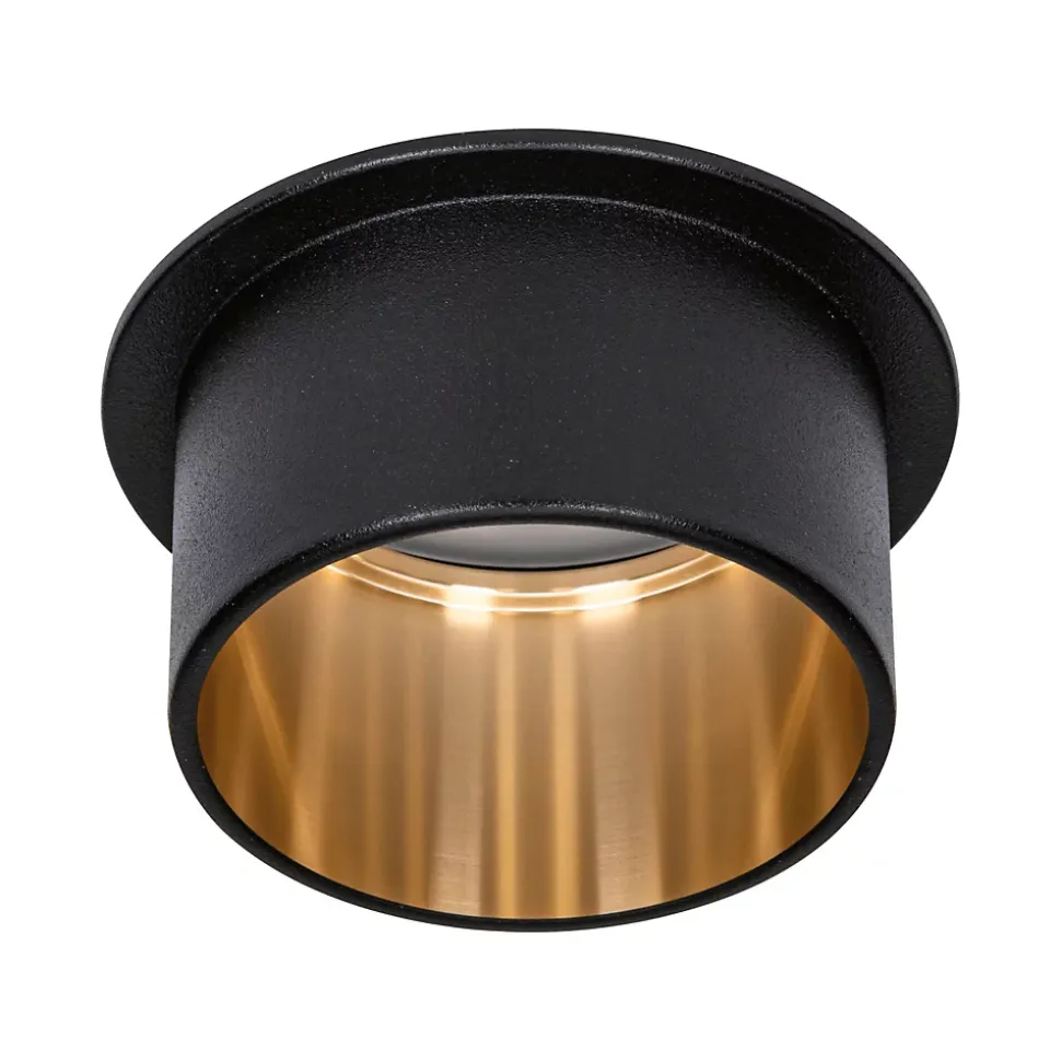 L’encastré décoratif Gil dans la couleur Noir mat#Doré au design bicolore assure un éclairage esthétique et apporte des accents non éblouissants au plafond. Grâce au cylindre décoratif proéminent, une faible profondeur d’encastrement est nécessaire par comparaison avec des points de lumière en retrait. Mais si tôt remarqués, ils aimantent le regard. Les projecteurs convainquent avec une technique brillante : les LED Coin remplaçables diffusent une agréable lumière blanc chaud. Ils se règlent sur trois niveaux avec un interrupteur conventionnel et sont combinables sans restriction. Ils requièrent un diamètre de perçage de 62 mm.