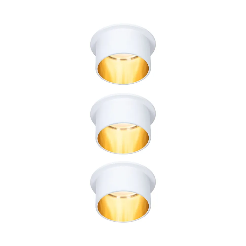 Les encastrés décoratifs Gil par kit de 3 dans la couleur Blanc dépoli#Doré au design bicolore assurent un éclairage esthétique et apportent des accents non éblouissants au plafond. Grâce au cylindre décoratif proéminent, une faible profondeur d’encastrement est nécessaire par comparaison avec des points de lumière en retrait. Mais si tôt remarqués, ils aimantent le regard. Les projecteurs convainquent avec une technique brillante : les LED Coin remplaçables diffusent une agréable lumière blanc chaud. Ils se règlent sur trois niveaux avec un interrupteur conventionnel et sont combinables sans restriction. Ils requièrent un diamètre de perçage de 62 mm.