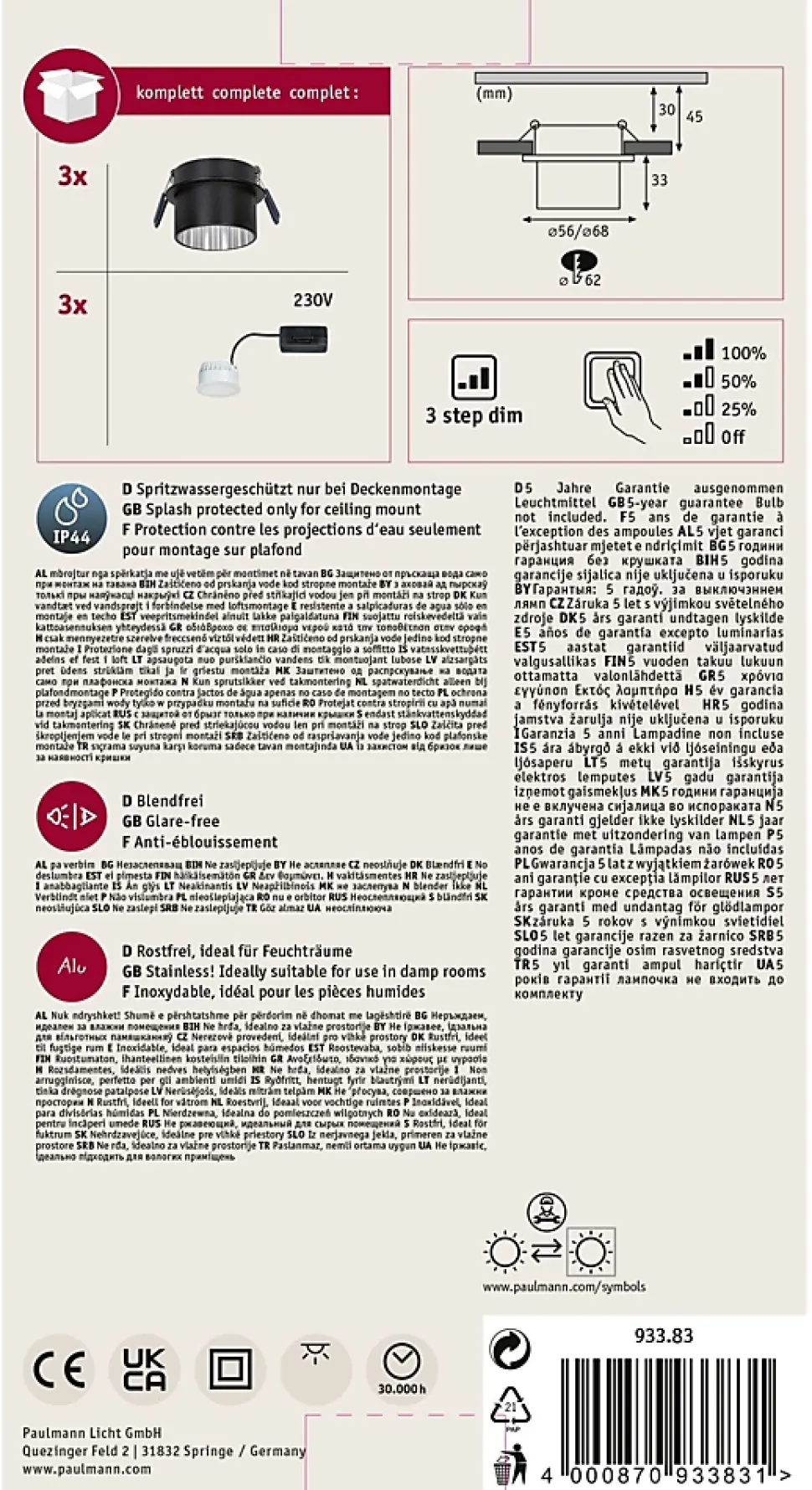 Un simple commutateur permet de faire varier la luminosité sur 3 niveaux|Ampoule LED amovible incluse|Température de couleur: 2700K – Blanc chaud|Pour raccordement direct au secteur 230V|Kit de 3 luminaires