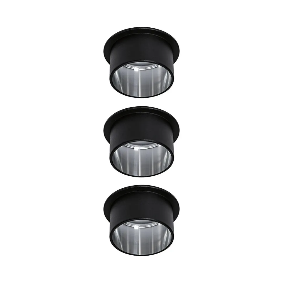 Les encastrés décoratifs Gil par kit de 3 dans la couleur Noir mat#Acier brossé au design bicolore assurent un éclairage esthétique et apportent des accents non éblouissants au plafond. Grâce au cylindre décoratif proéminent, une faible profondeur d’encastrement est nécessaire par comparaison avec des points de lumière en retrait. Mais si tôt remarqués, ils aimantent le regard. Les projecteurs convainquent avec une technique brillante : les LED Coin remplaçables diffusent une agréable lumière blanc chaud. Ils se règlent sur trois niveaux avec un interrupteur conventionnel et sont combinables sans restriction. Ils requièrent un diamètre de perçage de 62 mm.