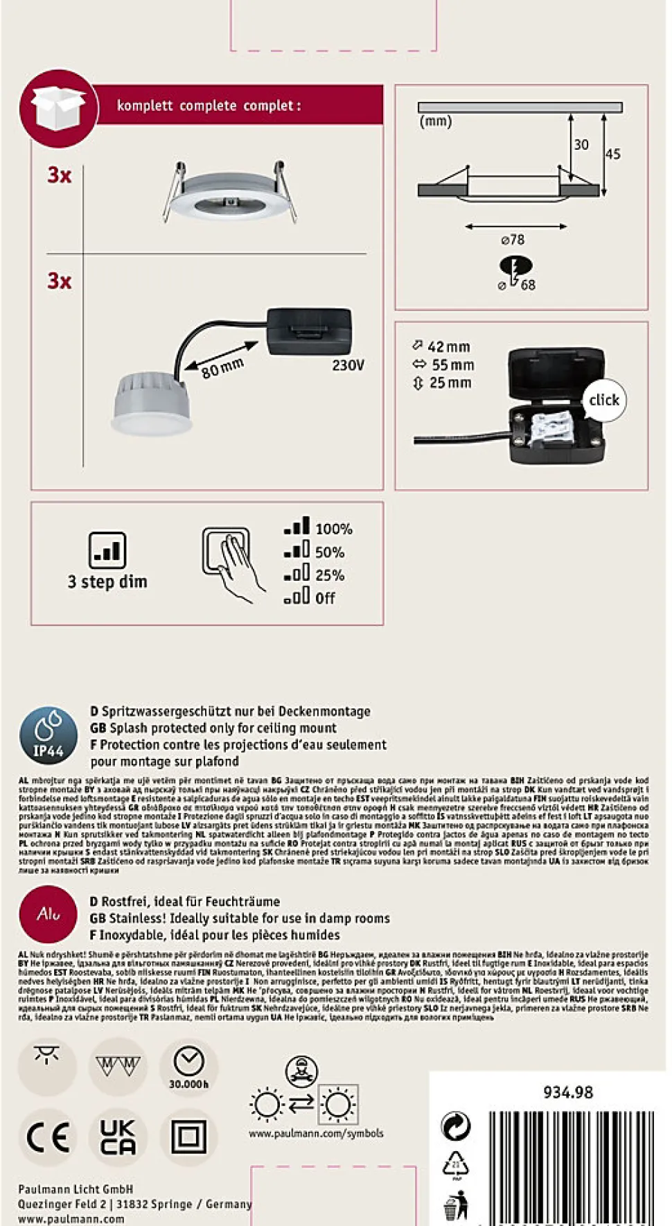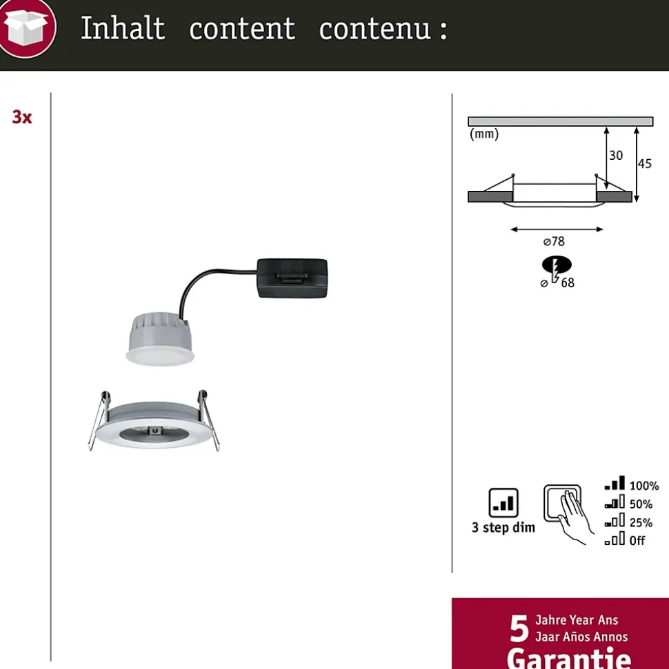 Kit composé de 3 luminaires fourni avec module LED|Température de couleur: 2700K – Blanc chaud|Pour raccordement direct au secteur 230V|Un simple commutateur permet de faire varier la luminosité sur 3 niveaux