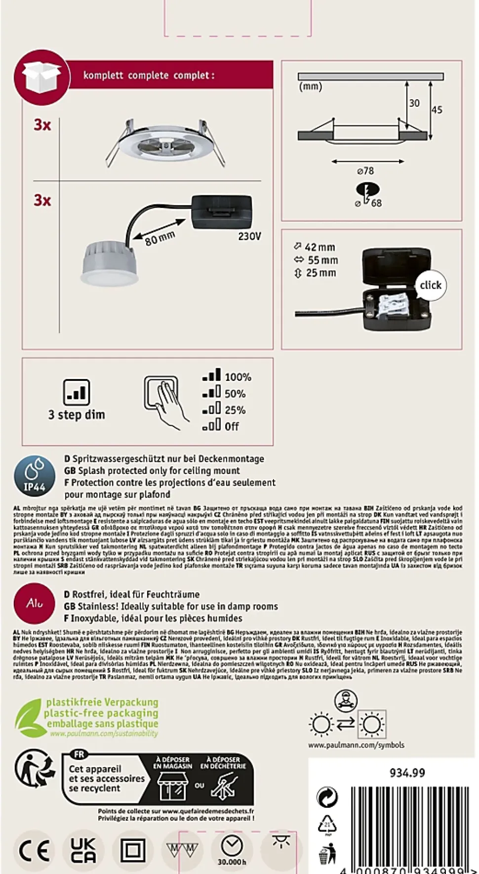 Kit composé de 3 luminaires fourni avec module LED|Température de couleur: 2700K – Blanc chaud|Pour raccordement direct au secteur 230V|Un simple commutateur permet de faire varier la luminosité sur 3 niveaux