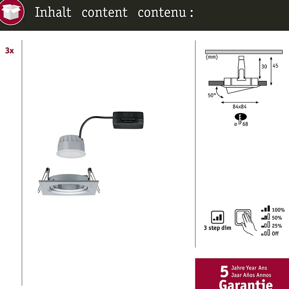 Kit composé de 3 luminaires fourni avec module LED|Température de couleur: 2700K – Blanc chaud|Pour raccordement direct au secteur 230V|Un simple commutateur permet de faire varier la luminosité sur 3 niveaux