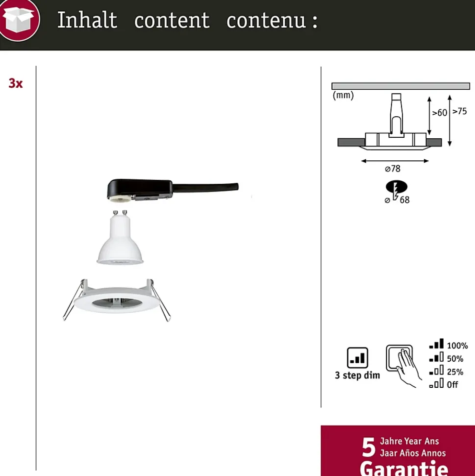 Les spots encastrés Nova ronds en blanc dépoli avec 3×6,5W et 3x460lm offrent une lumière agréable, un design adapté et une haute efficacité énergétique. Le style pur n’est pas dévalorisé par des circlips : Comme l’ampoule est insérée par l’arrière, nul besoin de circlip. Grâce à la connexion 230 V directe, vous pouvez très facilement connecter des luminaires entre eux sans aucune limite. La fixation simple par ressorts de retenue conserve le plafond intact, même après plusieurs montages et démontages. La livraison inclut des ampoules LED GU10 performantes et durables dont la lumière blanc chaud crée une atmosphère conviviale. La fonction 3-Step-Dim intégrée vous permet de naviguer entre trois intensités de lumière en actionnant plusieurs fois un simple commutateur traditionnel.